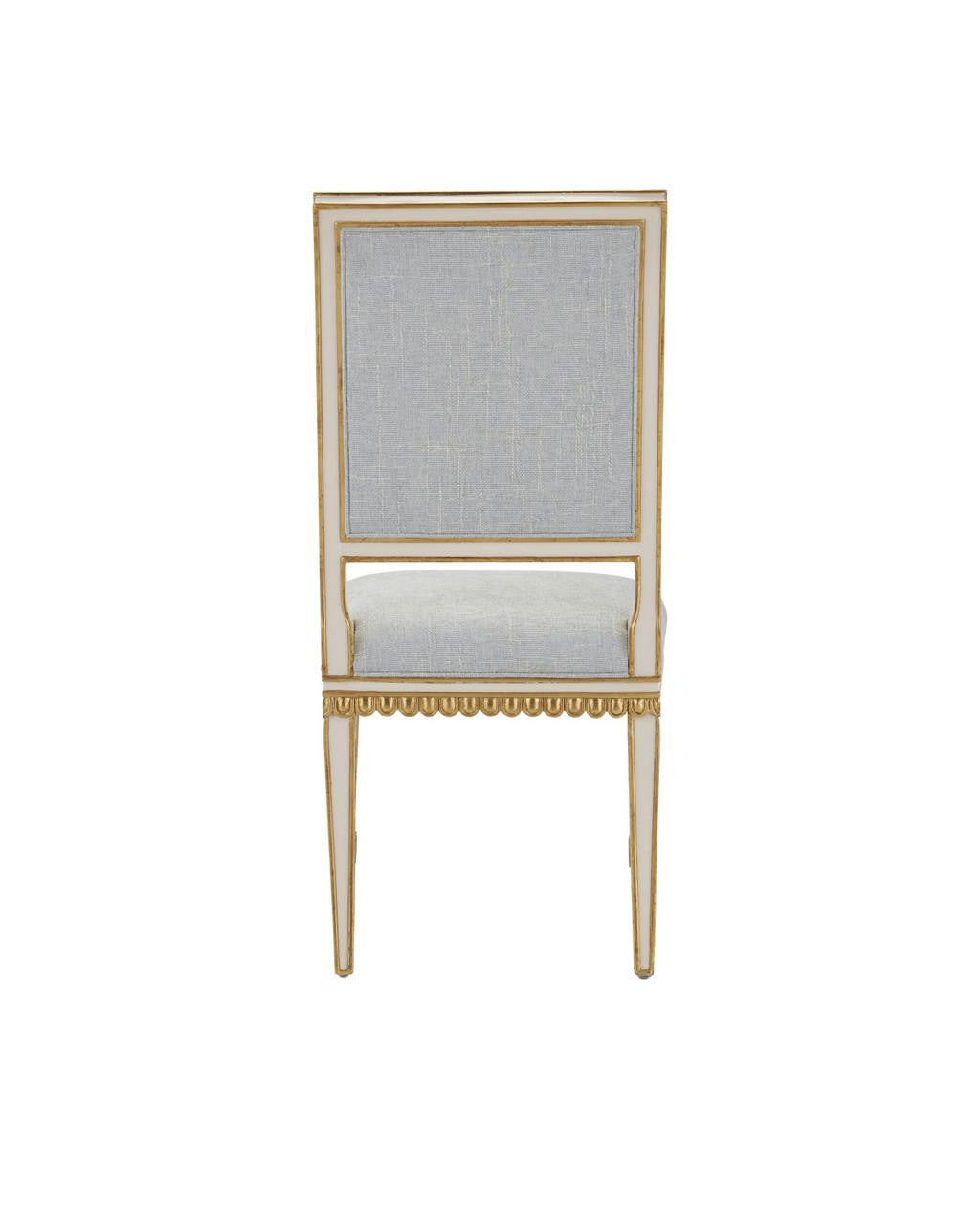 Inspired by a vintage Swedish Gustavian design, the Ines Ivory Chair with a Mixology Moonstone fabric seat exhibits the traditional light gray and pale white tones you’d expect from this famed stylistic era. The mahogany frame in an ivory finish is ornamented with antique gold accents that infuse the chair's design with added elegance. for anyone who seeks out furnishings that imitate European antiques with great pedigree, this is an excellent alternative.