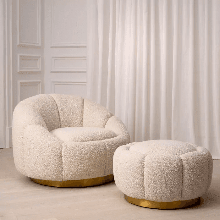 Designed with organic shapes in mind, Ottoman Inger boasts flower power. Inspired by a daisy, it features a Bouclé cream upholstery accentuated by deep stitching. This inviting pouffe demonstrates that bouclé pairs incredibly with curvilinear shapes. Perfect for pairing with the Inger Swivel Chair.