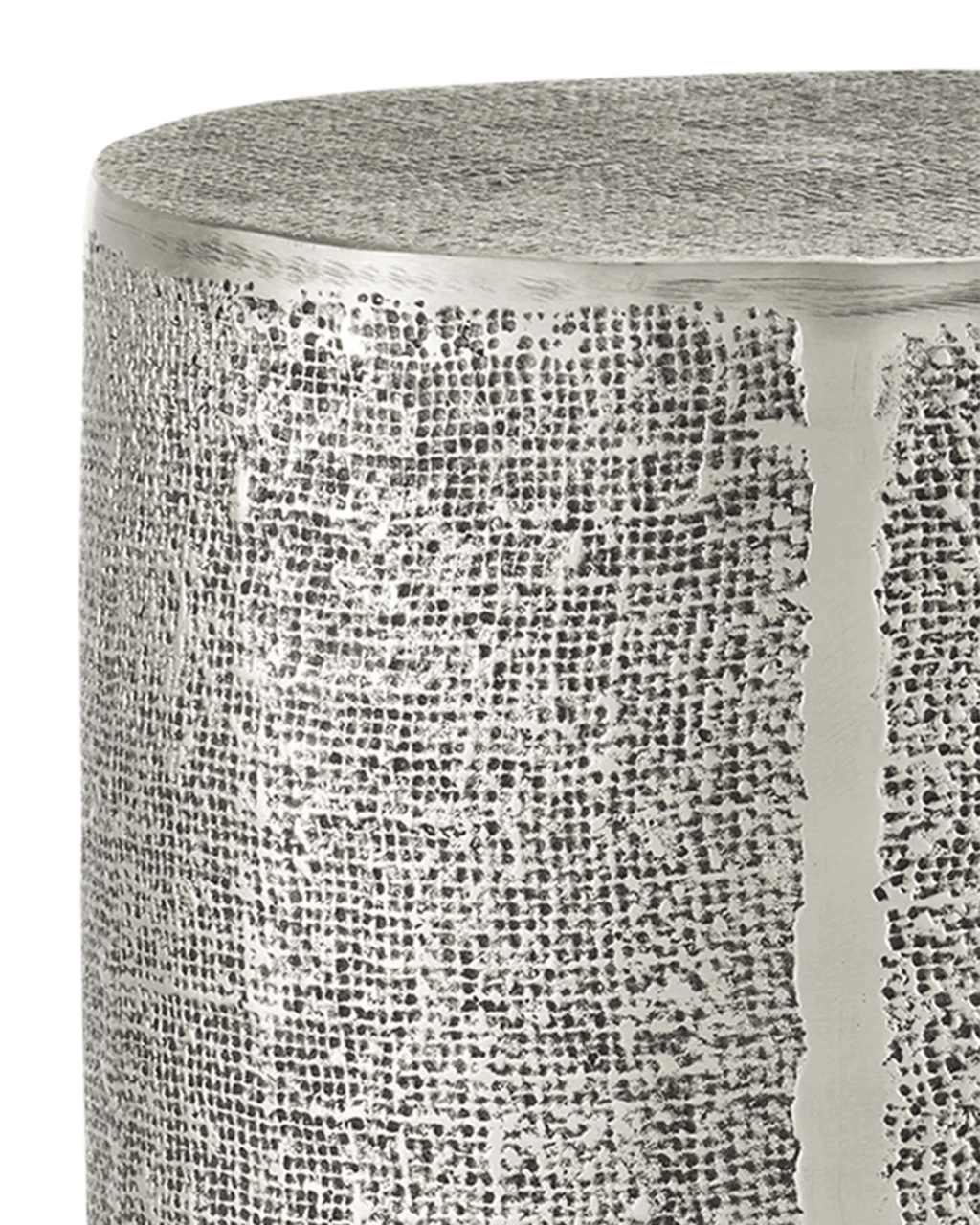 All the hallmarks of artisanship infuse the Kabeen Silver Accent Table with decorative creativity. Made of cast aluminum in an antique silver finish, the cylindrical table gleans its texture when a burlap sack is placed inside the mold. There are three mold lines, tell-tale signs of foundry craftsmanship, which are polished, as is the plinth base.