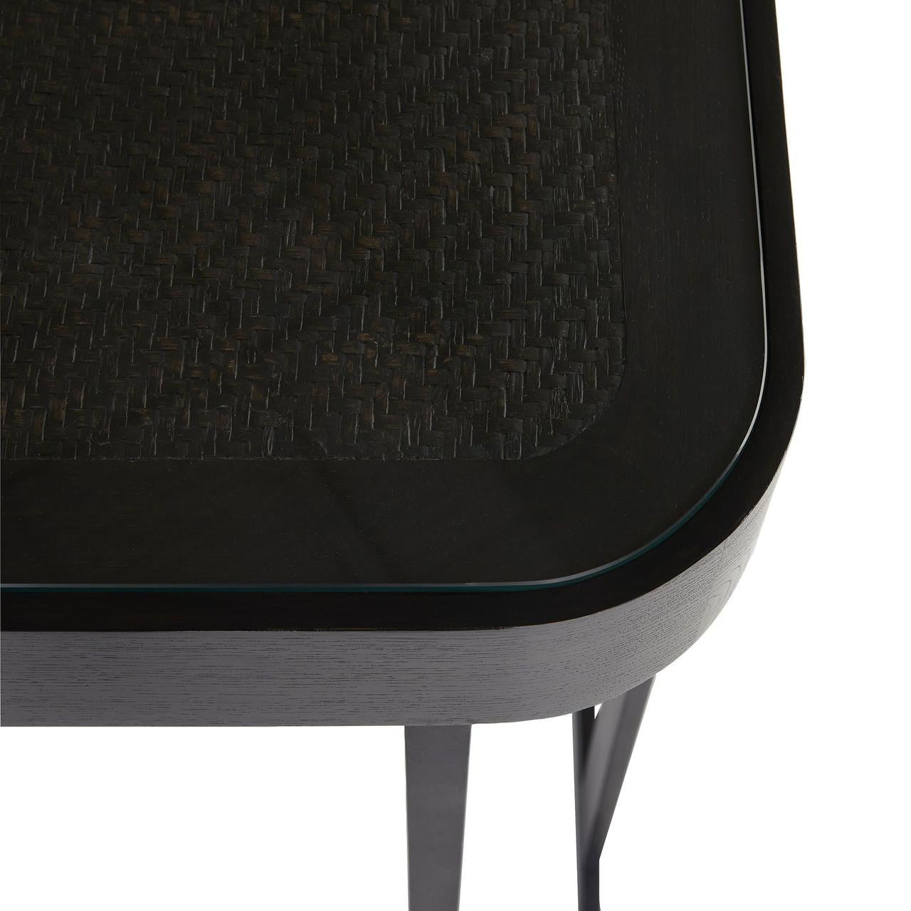 A unique blend of sleek design and masterful craftsmanship, the kaze desk finds a monochromatic balance with beautifully textured materials. Inset woven black rattan displays an intricate pattern, overlaid with a clear tempered glass top to provide a smooth writing surface. Black oak veneer details cuff the edges before transitioning to a bronze iron base. Its slender profile is ideal for small spaces.