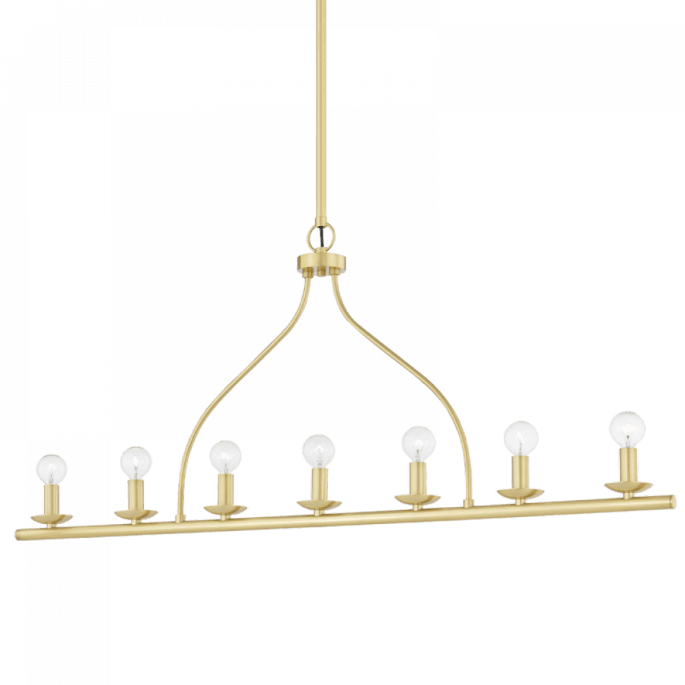 A classic silhouette gets an update. A curved suspension adds a surprising shape to this chandelier and linear fixture. Short metal candleholders fill the frames while filling any room with bright, clear light.