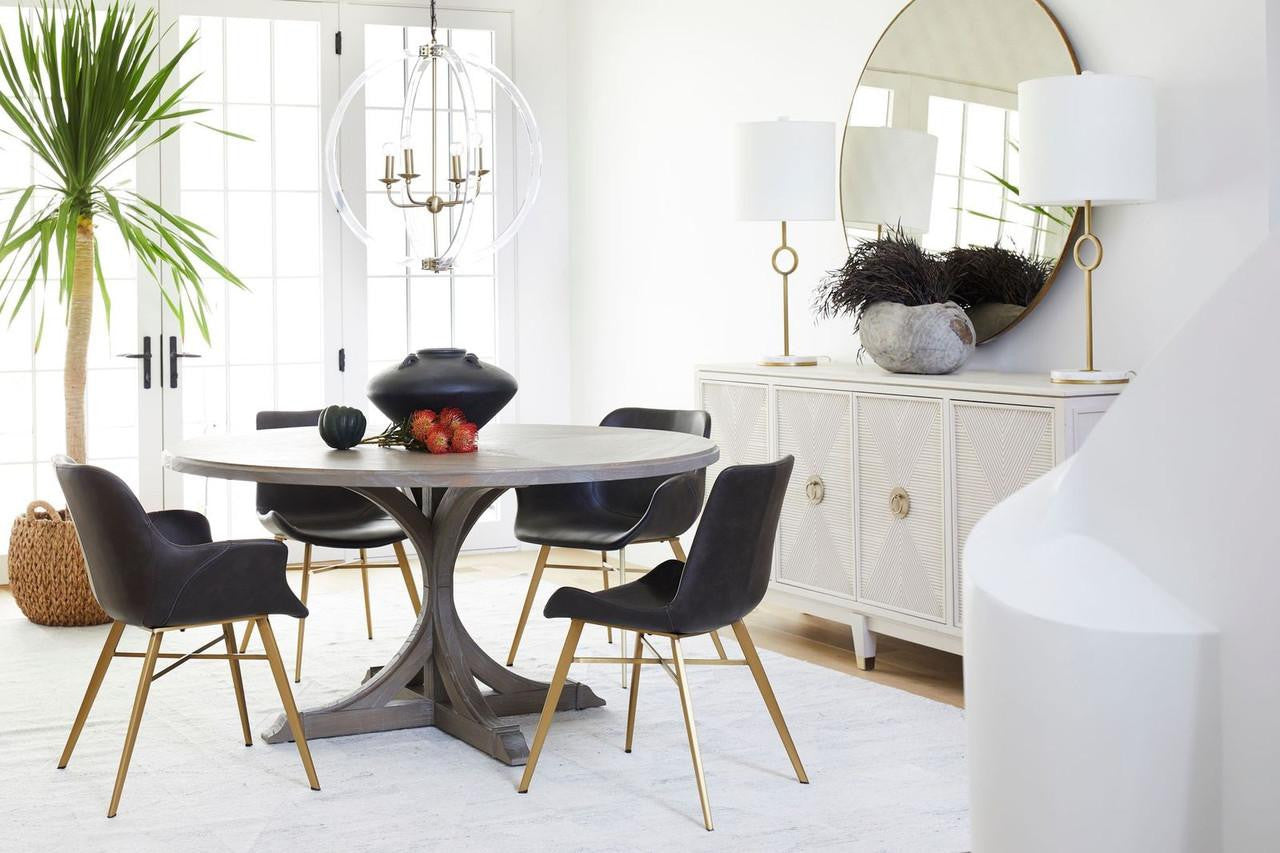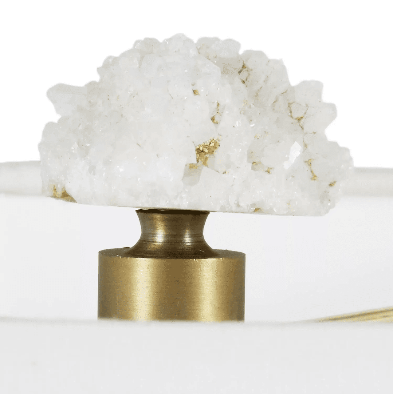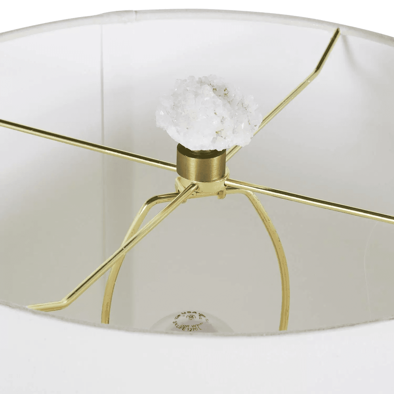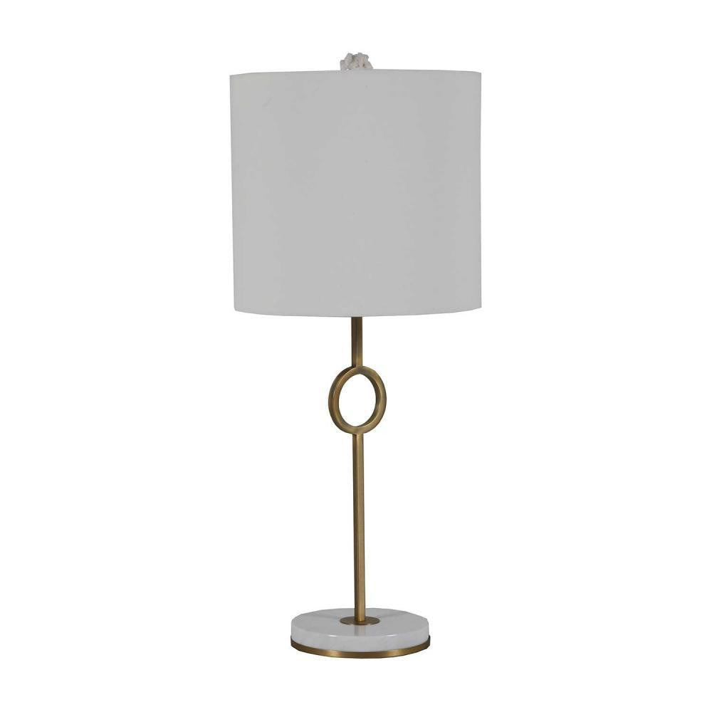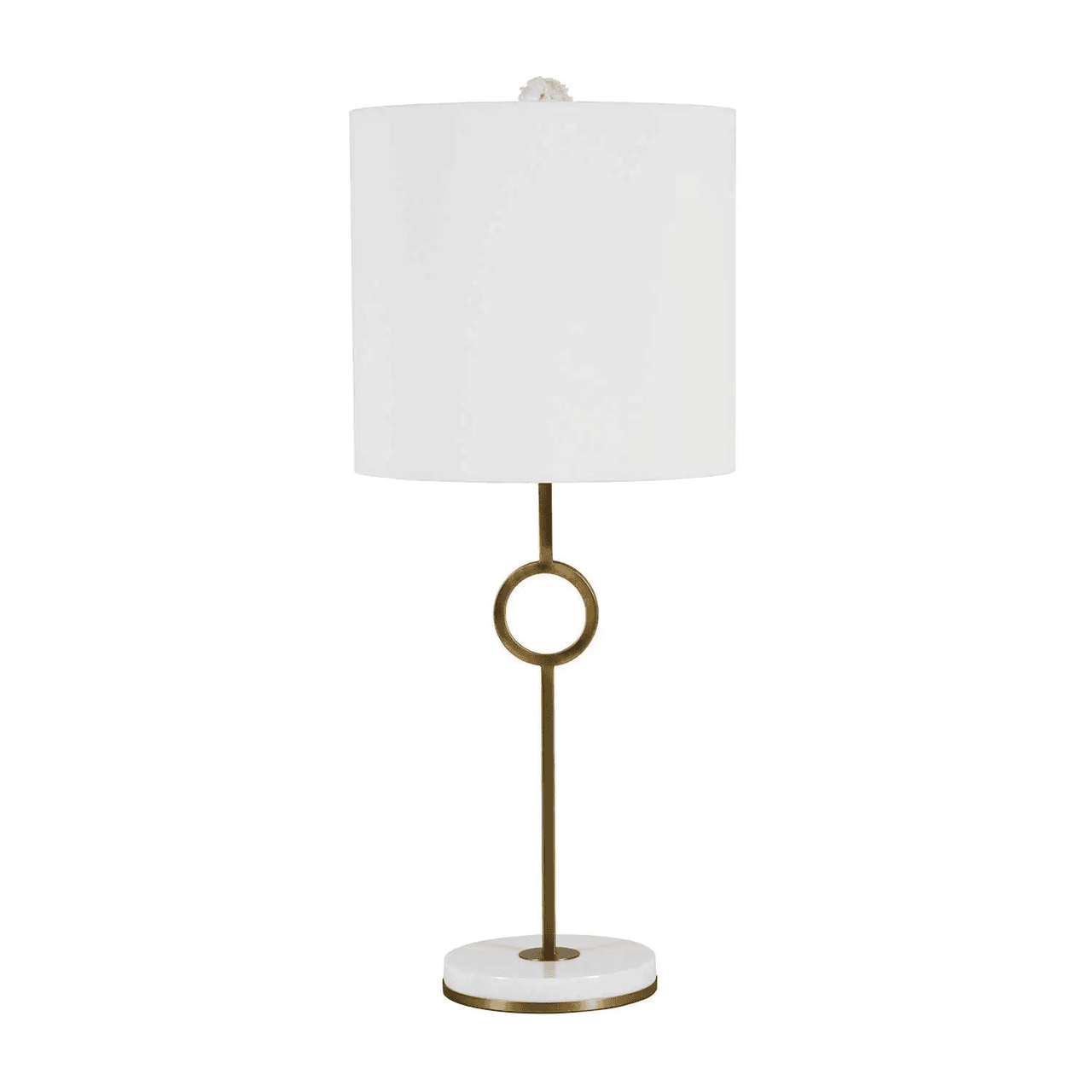 Chic & sophisticated with elegantly simple styling, the Kerry Lamp stands tall on a circular marble base. The matte antique brass column sports a circle design. Brass feet & an organic natural stone finial add refined accents..