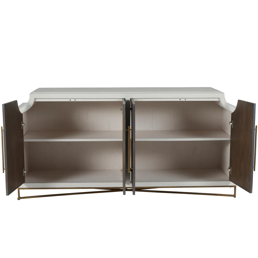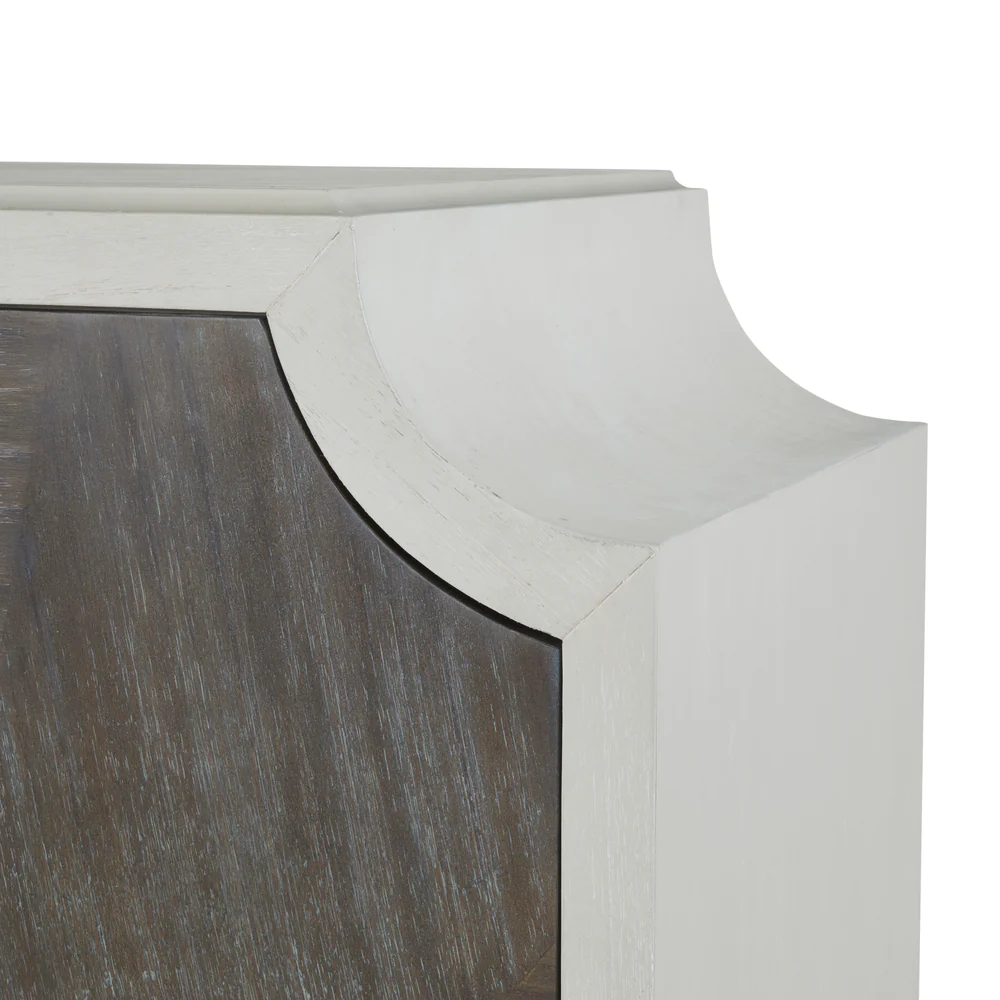Effortlessly elevate your home decor with the Kirsten Contemporary Wood Cabinet by Gabby, a fine addition to any living room, entryway or lounge. Featuring simple styling in a traditional shape, this cabinet creates a dramatic accent by contrasting a cerused coal against a white frame. The distinctive wood pattern on the doors adds unique appeal to this piece that features bite detailing at the top, combining with the streamlined "X-style" legs to add an airy aesthetic to this large cabinet. Stained brass door pulls and soft-close door mounts adorn this masterpiece.