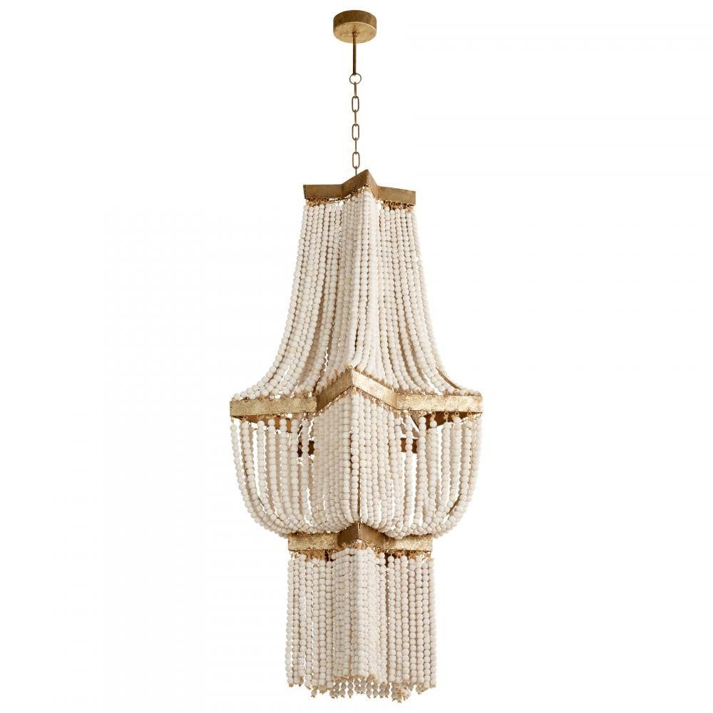 This three-light large tinted gold leaf iron and wood pendant delivers a heady vintage motif in a transitional space. Exotic and enticing strands of creamy wood beads cascade from gold leaf iron supports, creating a layered look with a ton of personality.