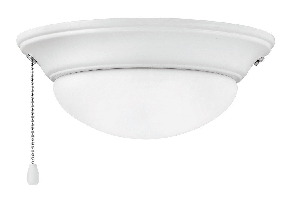 The Small Low Profile Fan Light Kit features a clean and simple design with an Etched Opal shallow dome shade complemented by an Matte Black, Chalk White, Appliance White, Metallic Matte Bronze, Graphite, or Brushed Nickel finished Rim. Operates with pull chain. Can be used with Hinkley Fans only. UL listed. JA8 compliant.
