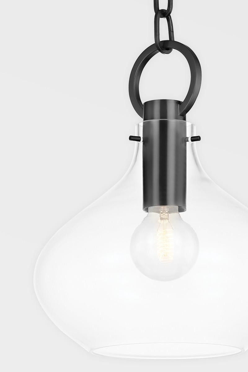 Lina is bound to be a staple in the designer repertoire. An organically inspired glass shade veers from the standard globe style, lending plenty of character to this versatile style. The exaggerated hanging ring sets the piece apart, the modified teardrop hanging delicately from its oversized clasp.