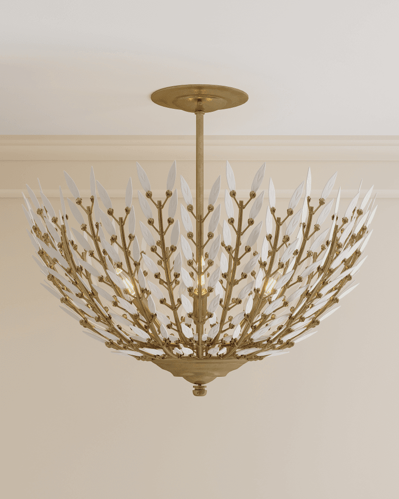 Undertaking the challenge of creating a clean-lined version of a vintage design, the Magnum Opus Semi-Flush Mount features rows of more than 300 glass leaves attached to the metal stems that effervesce when light strikes them to create a stunning sculptural fixture. The white glass also beautifully contrasts the metal in a brass finish, the cool/warm contrast bringing the gold semi-flush a heightened level of interest. The beautiful white glass leaves also surround the bulbs on this fixture to infuse a space with a lovely glow. Adjustable from 25.5" to 93.5" with use of included chain/rod kit/cable. If your space calls for a longer drop, additional chain/rods/cable is available for purchase.