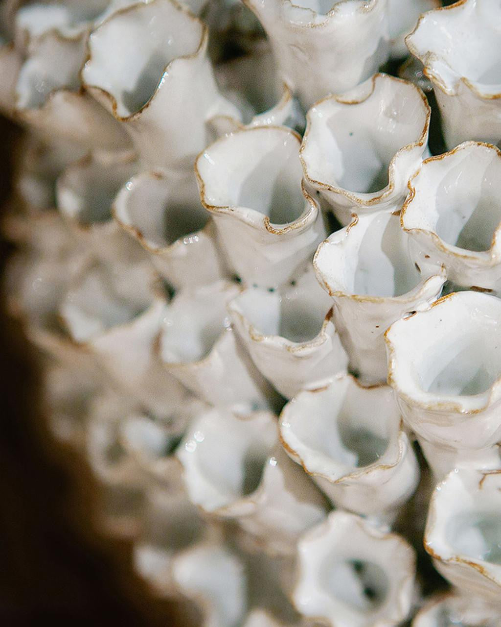 The Manitapi Medium White Vase is made by a group of women who live at the border of Burma and Thailand. Made from black terracotta, this incredible hand-thrown white vase is completely covered in handmade bell-shaped flowers. Once the blossoms are in place, the vase is glazed with a crisp white.
