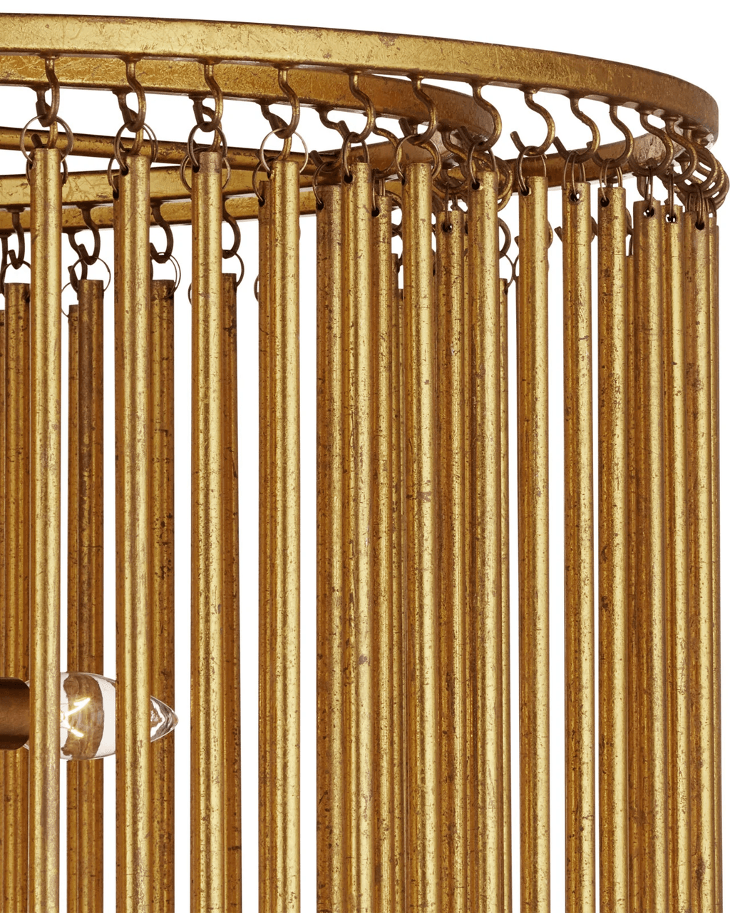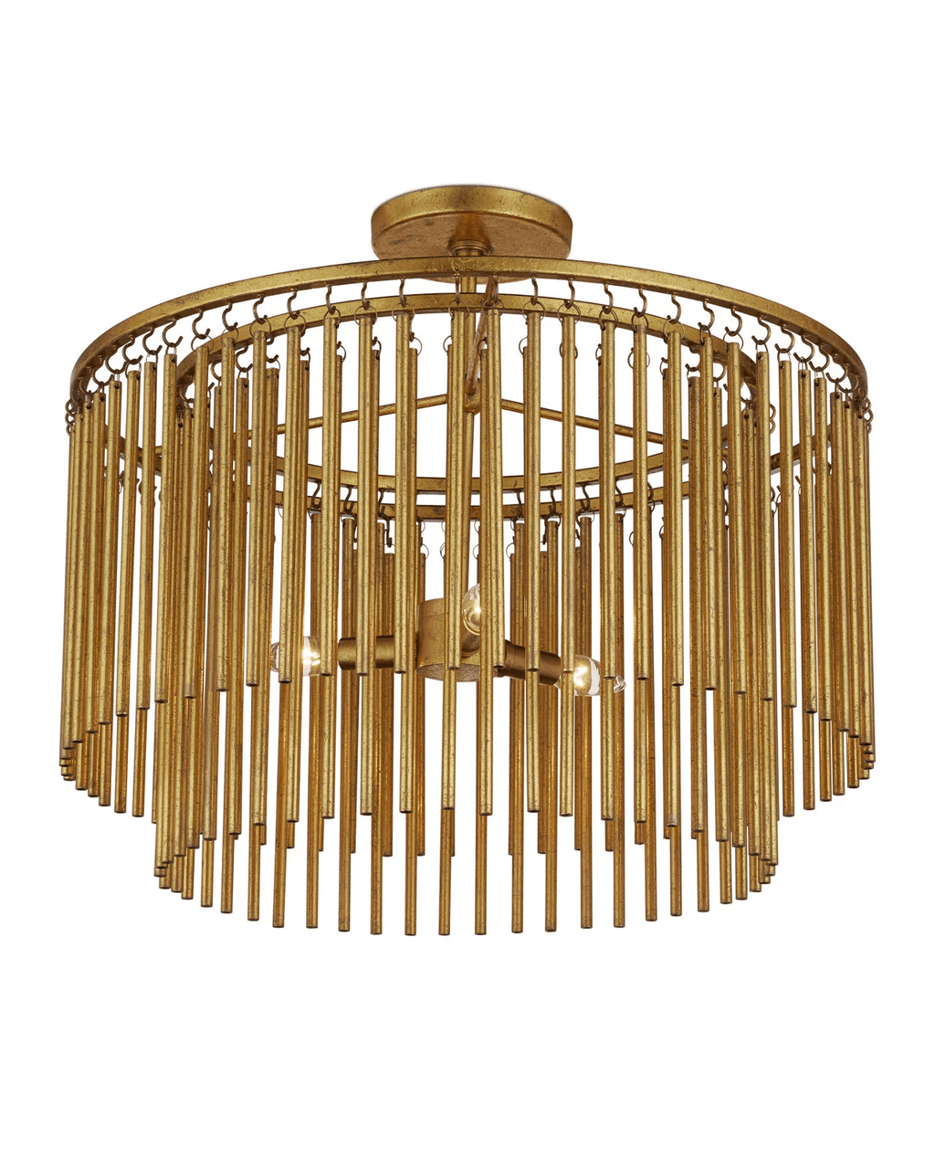 The Mantra Semi-Flush Mount is an elegant example of mid-century modern luxe. The gold leaf finish on the long tentacles of metal that dangle from its two tiers bring the fixture a powerful punch of patina. This is due to the distressing the finish artisans achieved with the gold leaf treatment on the chandelier. A shrewd design detail is how the rods of metal are affixed with small hooks, each of which has to be hand-welded to the circular frames of the gold semi-flush.