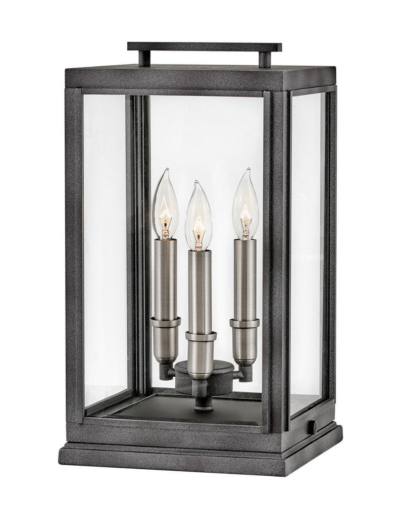 The Sutcliffe collection conveys chic elements of early Americana styling. The candelabra lamping, clear glass and reflector infuse this sleek pocket lantern design constructed of solid aluminum with a perfect blend of old and new.