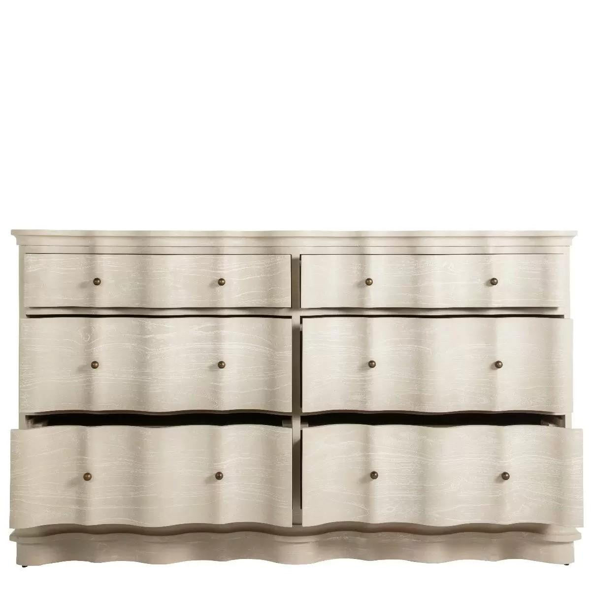Help your decor exude timeless elegance with the Meredith Traditional 6 Drawer Dresser by Gabby. Crafted with a gracefully rippled facade coated in a beautifully textured cerused white finish, this six drawer mindy wood dresser showcases a sophisticated design with its understated brass pulls and ample storage. The wavy drawer fronts add a unique touch of charm, making the Meredith Dresser an elevated addition to bedroom settings. The finish Natural variations in the wood grain ensure each piece is unique, adding to its distinctive appeal.