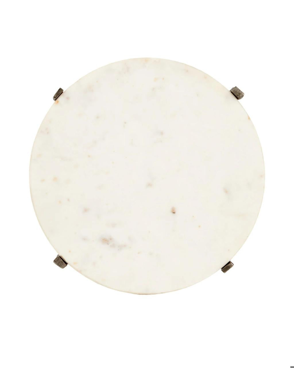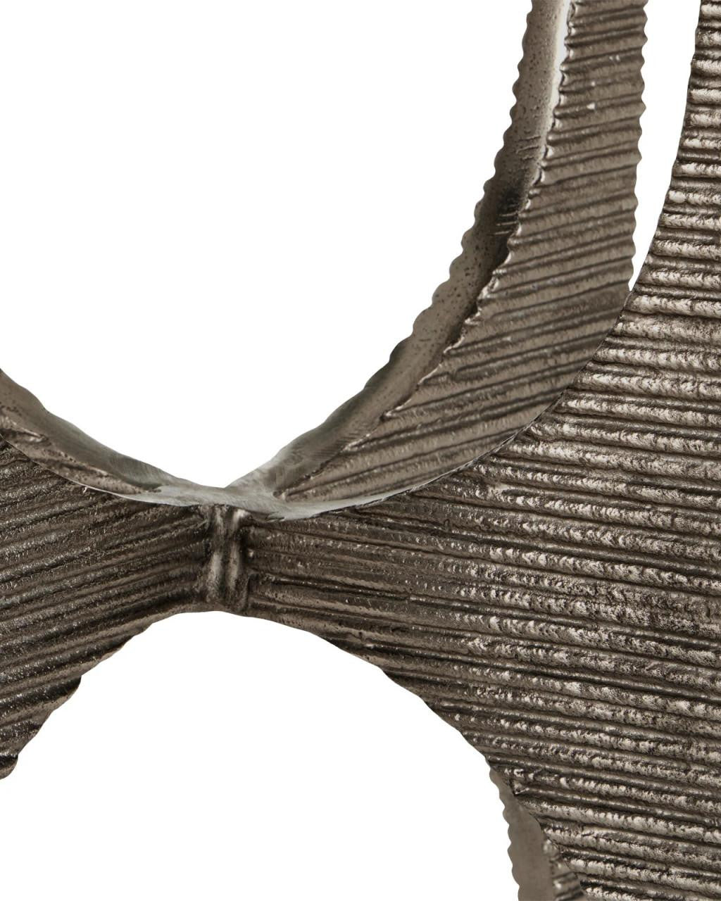Serious about its ability to wow, the Micha Marble Accent Table has lines pressed into its metal surfaces that bring it a dynamic texture and a sense of movement. Made of textured cast aluminum in an antique nickel finish, the base is handmade so the striations on the legs and base will vary slightly. The silver accent table holds the white stone top as brilliantly as it shines, the removable disc fitted with felt pads on the bottom. The way the upper and lower u-shaped negative spaces intersect introduces added character to the design.