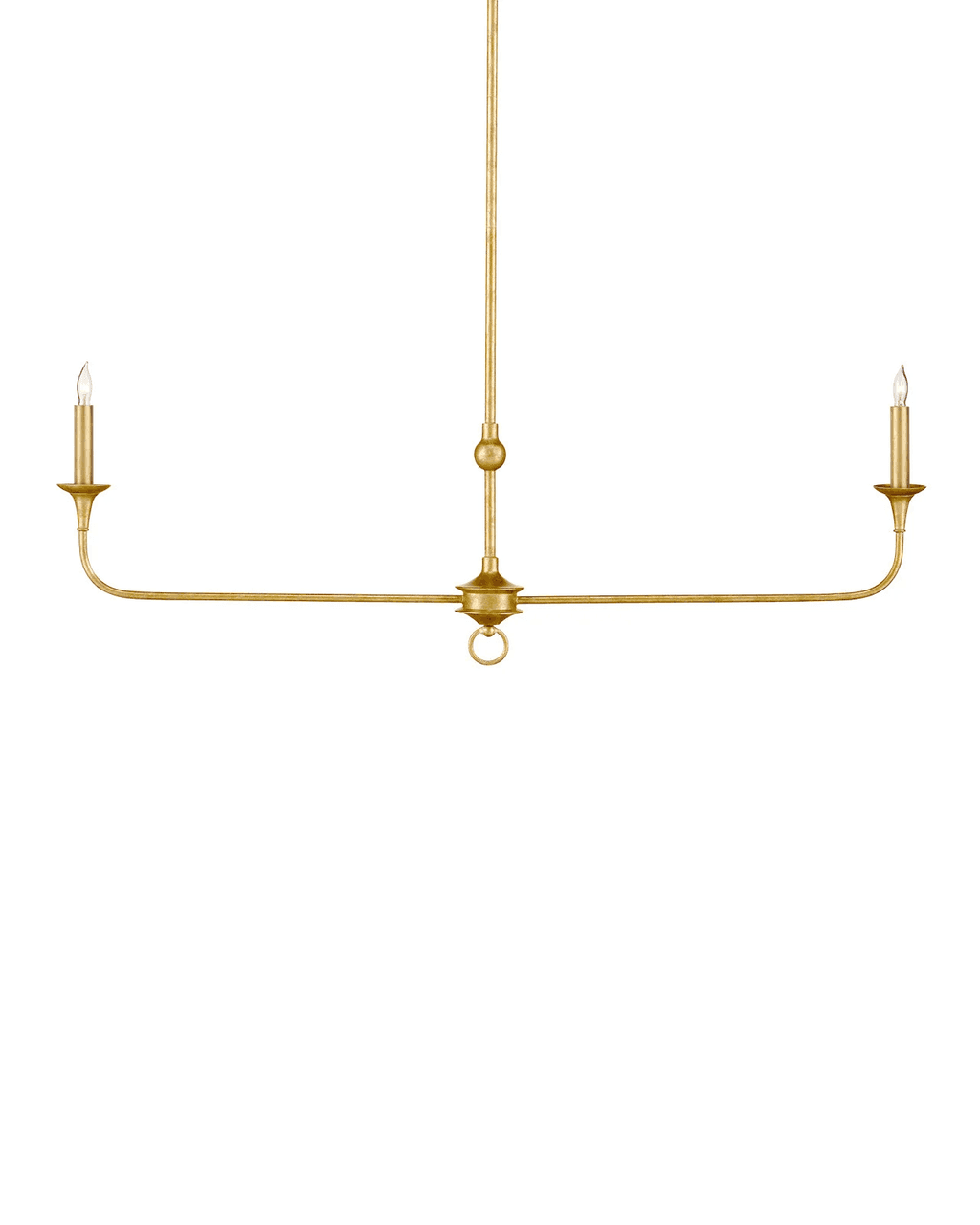 The Nottaway Linear Gold Chandelier has long arms that stretch gracefully from a small cog and a ring that ornaments its bottom-most point. The profile of the fixture has a lovely fluidity to it, and the contemporary gold leaf finish adds textural interest to the gold chandelier. The fact that the chandelier is hung from a rod rather than a chain modernizes this design, though it is still decidedly in the traditional design vernacular. Its shape makes it perfect for above kitchen islands and bars. Adjustable from 23.25" to 65.25" with use of included chain/rod kit/cable. If your space calls for a longer drop, additional chain/rods/cable is available for purchase.