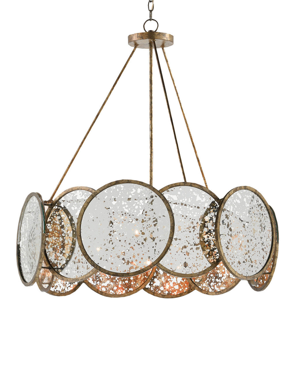 A ring of mirrored panels brings the Oliveri Chandelier an extra dose of luminosity whether the light source is switched on or off. The circle of circles dangles from a canopy on thin bands of wrought iron, all of the metal surfaces on the fixture treated to a Pyrite bronze finish. The distressing and the tones of the finish echo the darker patinas in the Raj mirror set within by the rounded metal frames.