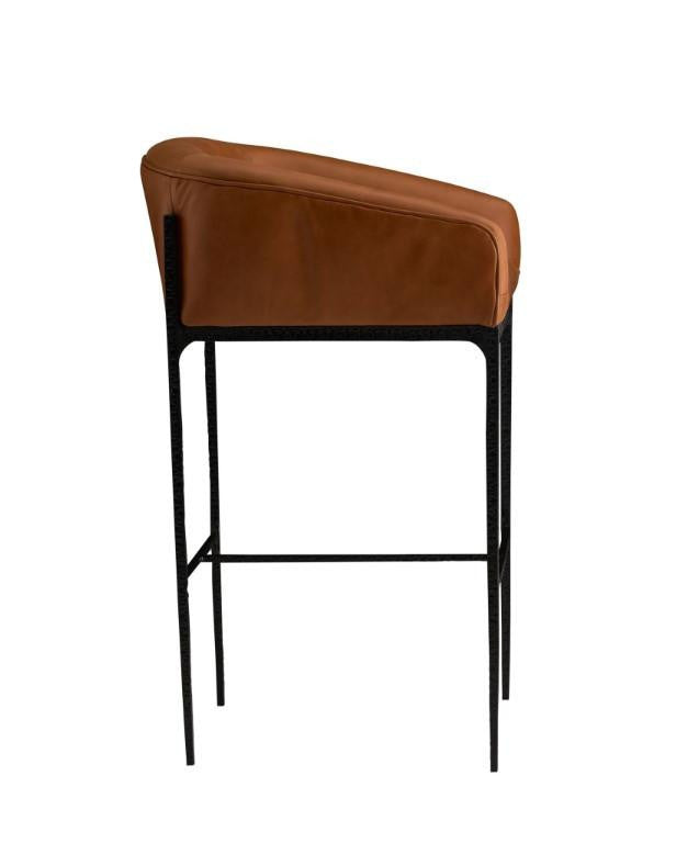 A hammered iron frame and handsome russet leather make this bar stool ultra-chic. The low, barrel-style shape gives lumbar comfort and support while allowing the stool to tuck neatly under a bar or countertop. Its modern style brings sophistication and polish to a space. Leather and finish will vary.