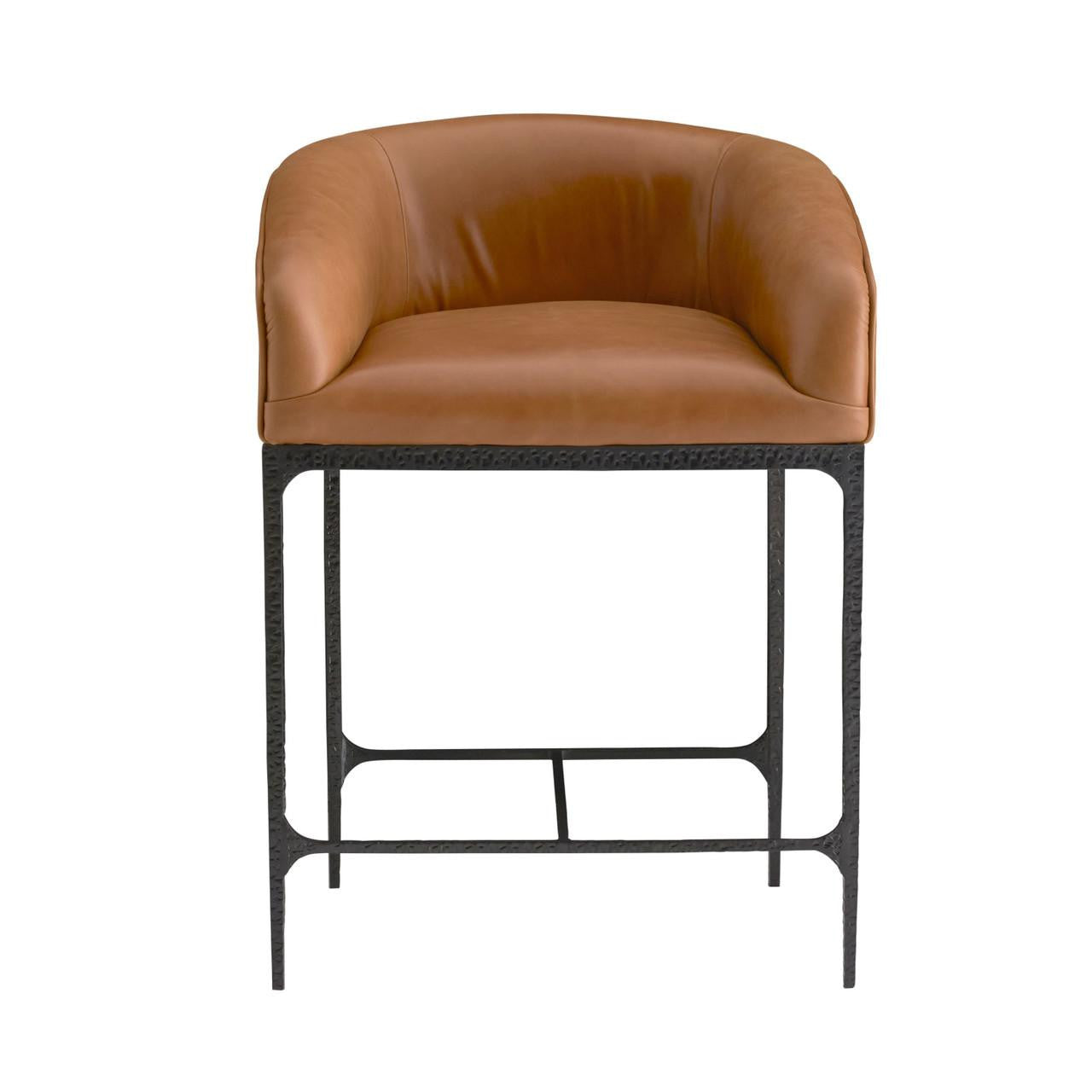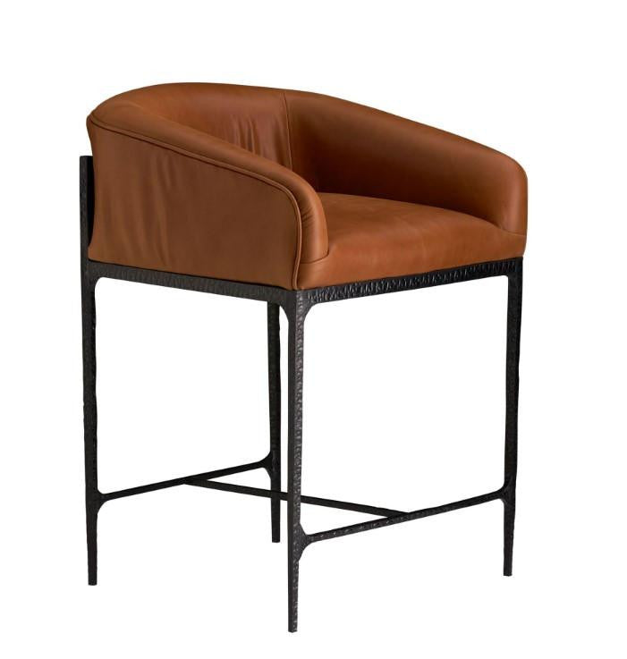 A hammered iron frame and handsome russet leather make this bar stool ultra-chic. The low, barrel-style shape gives lumbar comfort and support while allowing the stool to tuck neatly under a bar or countertop. Its modern style brings sophistication and polish to a space. Leather and finish will vary.