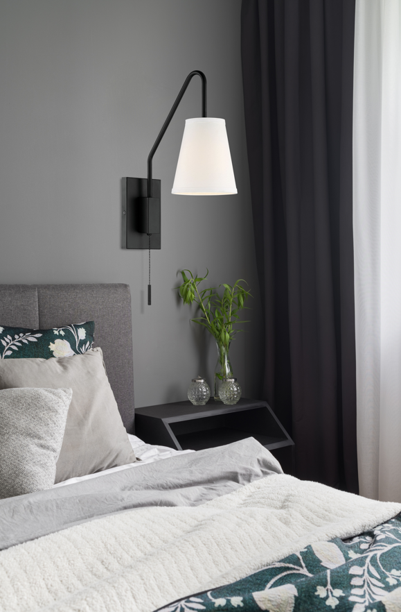 Style and versatility define the Owen sconce! It has a sleek design including an angular, curved light arm that is adjustable, swinging from side to side for light exactly where you need it. A white fabric shade filters light from one 60W standard size bulb for a soft, comfortable glow. The matte black finish of this sconce looks terrific with any color palette and other hardware in your home. Plus, the white fabric is a terrific contrast to the black, creating an overall look that blends well with bohemian, vintage, farmhouse and other decor styles. It comes with a decorative pull chain and may be hard-wired or used with included cord and plug. Adjustable arm sconces are incredibly flexible. Use them in place of table lamps, mount them at the bedside or have them as task lighting for living rooms and other spaces.