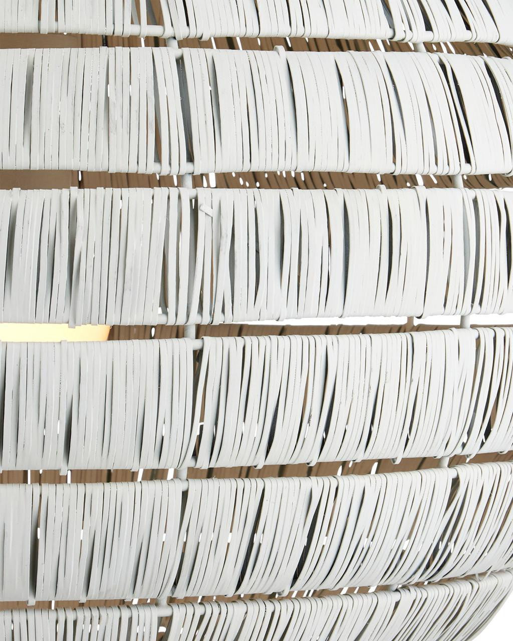 The Panopolis White Pendant is created using a painstaking process whereby artisans wrap individual thin strips of metal around rings that are spaced evenly to form a textural globe. The spaces between the wrapped tiers and the open bottom allow more light to filter through. This orb pendant will cast powerful patterns onto surrounding walls. Adjustable from 26" to 92.5" with use of included chain/rod kit/cable. If your space calls for a longer drop, additional chain/rods/cable is available for purchase.