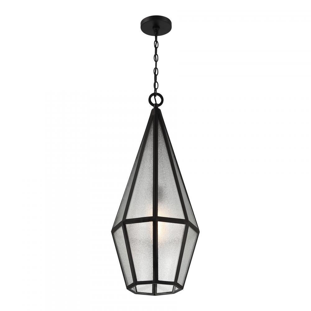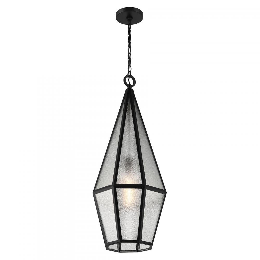 Decorate your great outdoors with the highly glamorous Savoy House Peninsula 1-light outdoor hanging lantern. Its tall, slim, diamond-like design showcases panes of art glass that obscure the light within and create lots of eye-catching texture. Matte Black finish. Peninsula is 32.5" in height and 12" in width. Uses one standard size bulb of up to 60 watts. The bulb is not included. Damp area rated.