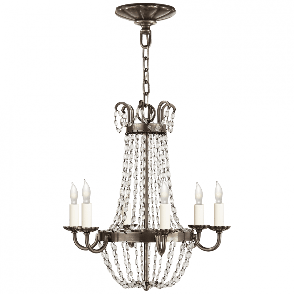 Add vintage charm and French sophistication to your space with the Paris Flea Market Chandelier. Adorned with gleaming candlestick lights and delicate strands of seeded glass that drape gracefully around the frame, this chandelier exudes timeless glamour. Designed by Visual Comfort Signature (formerly Visual Comfort), this piece evokes the elegance of Art Deco with its intricate beaded glass and scalloped bobeches. Perfect for elevating a dramatic dining room filled with antiques or an eclectically styled traditional living area, this 33-inch chandelier features a round canopy, candelabra bulb sockets, and a suspension chain.