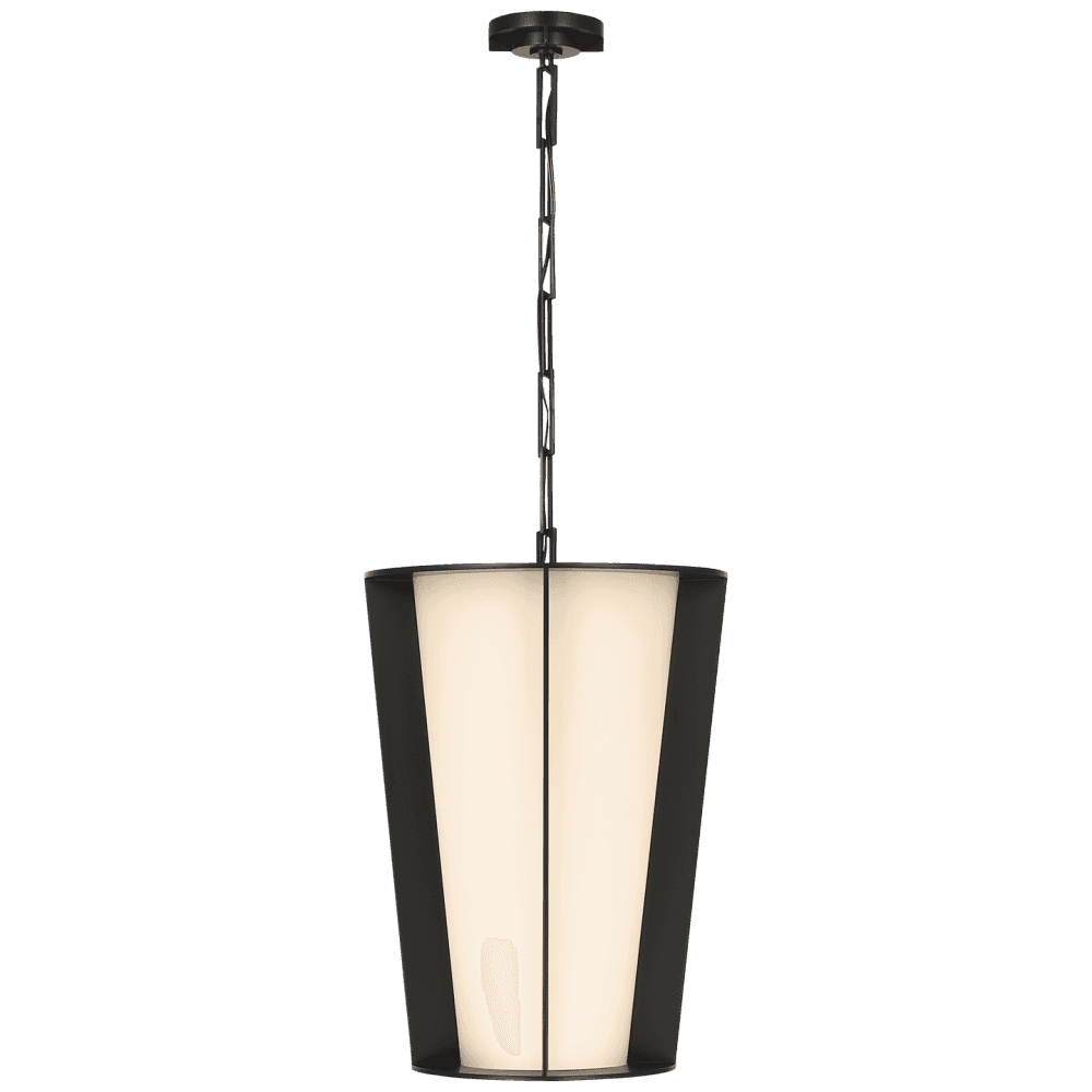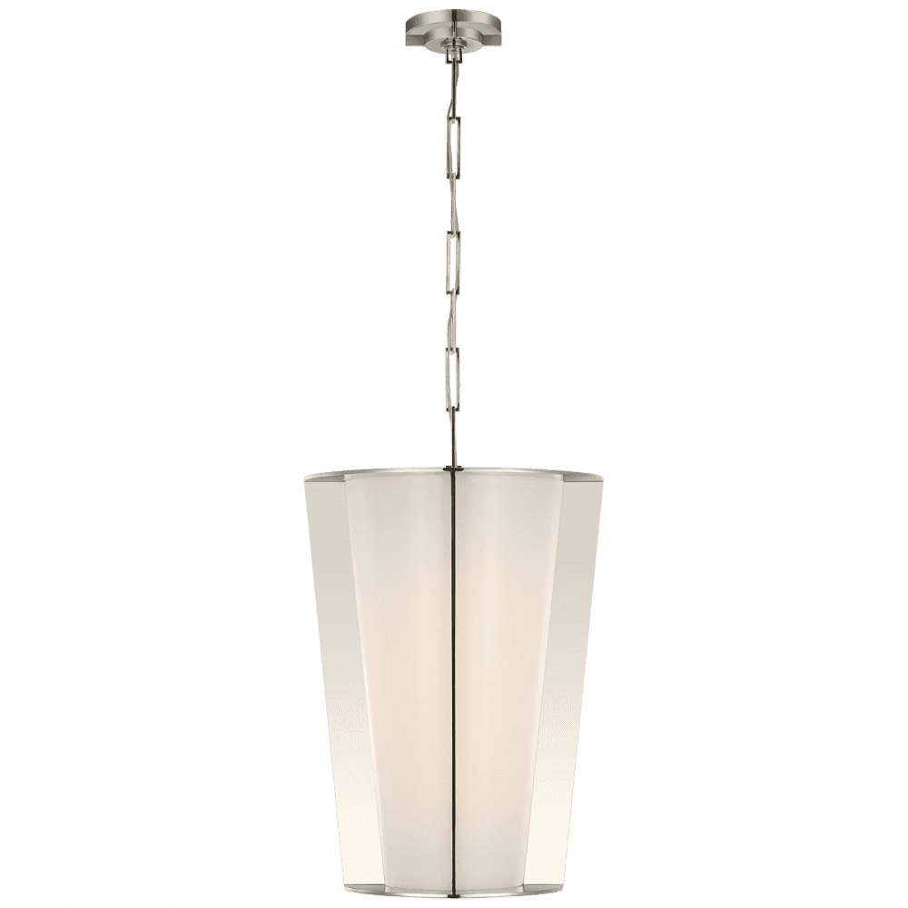 The Phinn LED Pendant from Visual Comfort Signature offers a modern take on traditional lantern forms, featuring sleek lines and carefully crafted steel framing. Designed by Barbara Barry, the pendant showcases a tapered profile that narrows toward the bottom, reflecting her signature sense of restraint. The glass panels divide the light into distinct sections while maintaining harmony with the central LED light source. Ideal for hanging above dining tables, kitchen islands, or stairwells, this pendant's vertical presence creates a seamless connection between different levels of the home. The chain-link suspension adds a touch of texture, supporting the robust glass and steel construction.