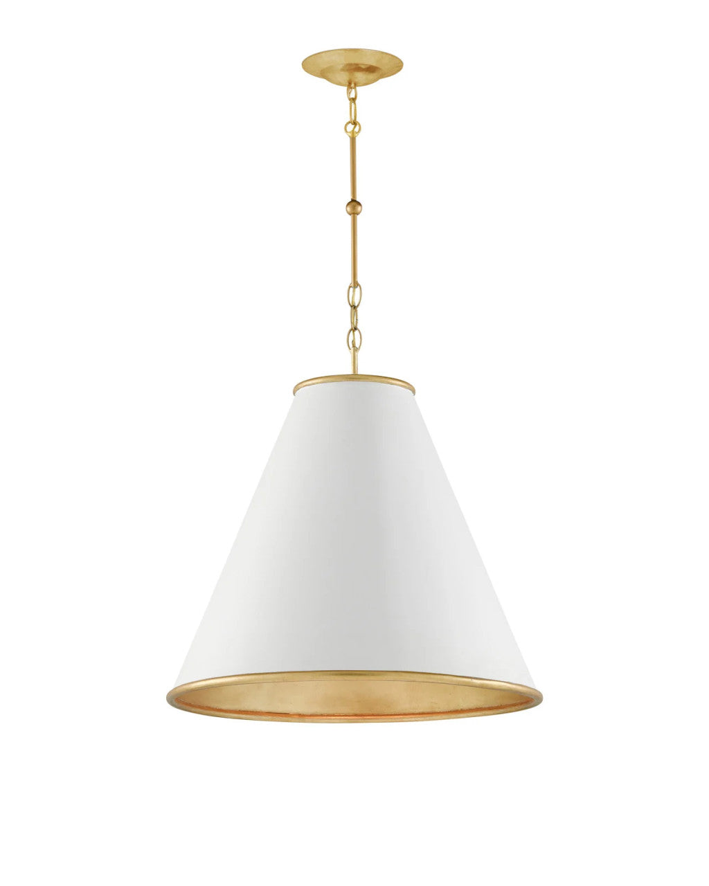 Our Pierrepont White Large Pendant is made of wrought iron with a gesso white finish on its exterior and a contemporary gold leaf finish on the interiors of the shades. The rings connecting them gleam in a painted gold finish. There are a number of other sizes and finishes in the Pierrepont family of fixtures. Adjustable from 27" to 104" with use of included chain/rod kit/cable. If your space calls for a longer drop, additional chain/rods/cable is available for purchase.