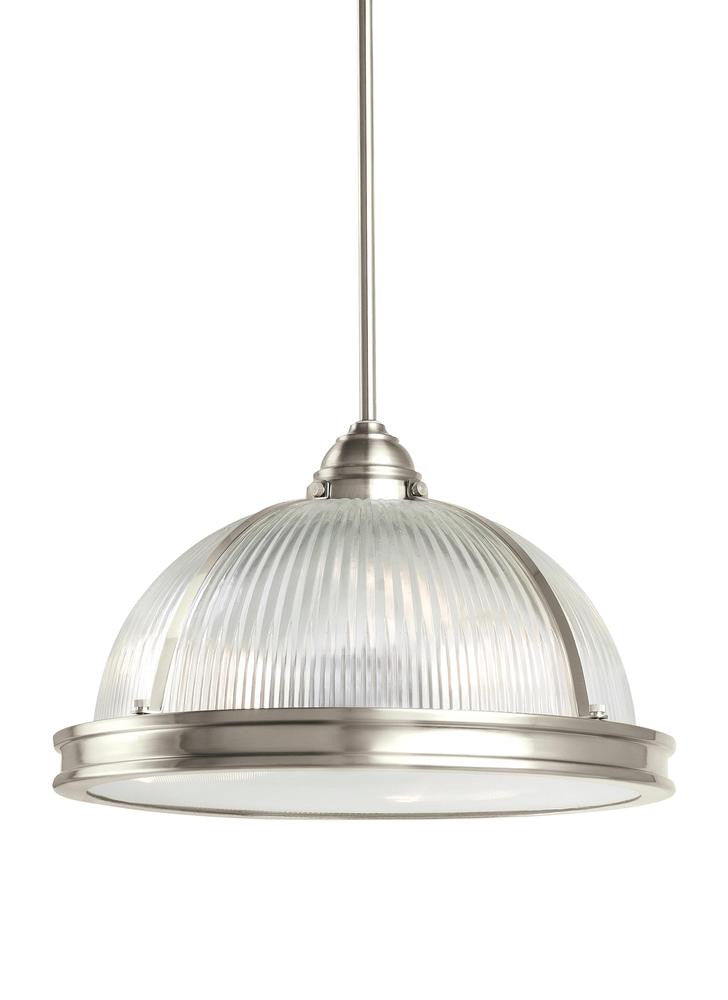 The Sea Gull Lighting Pratt Street prismatic three light indoor pendant in brushed nickel is an energy star qualified lighting fixture that uses fluorescent bulbs to save you both time and money.Inspired by industrial lighting, the hard-working, large-scale Pratt Street prismatic pendants by Sea Gull Lighting put light where you need it, while making a significant design statement.Offered in a choice of brushed nickel or autumn bronze finishes, the one-light, two-light and three-light prismatic glass pendants are all fully enclosed with a prismatic diffusor at the bottom to spread light output evenly and alleviate glare.The pendants are available in incandescent and energy star-qualified led versions, and all can easily convert to led by purchasing led replacement lamps sold separately.