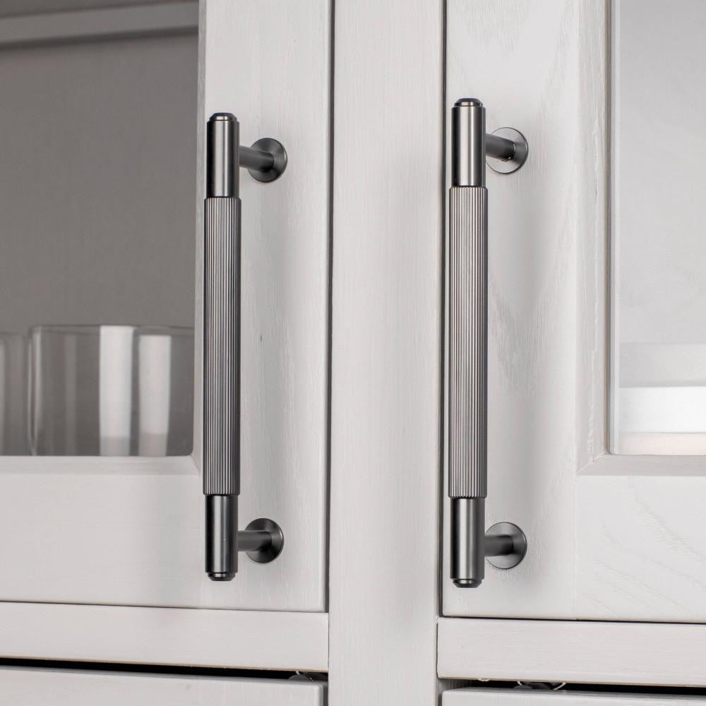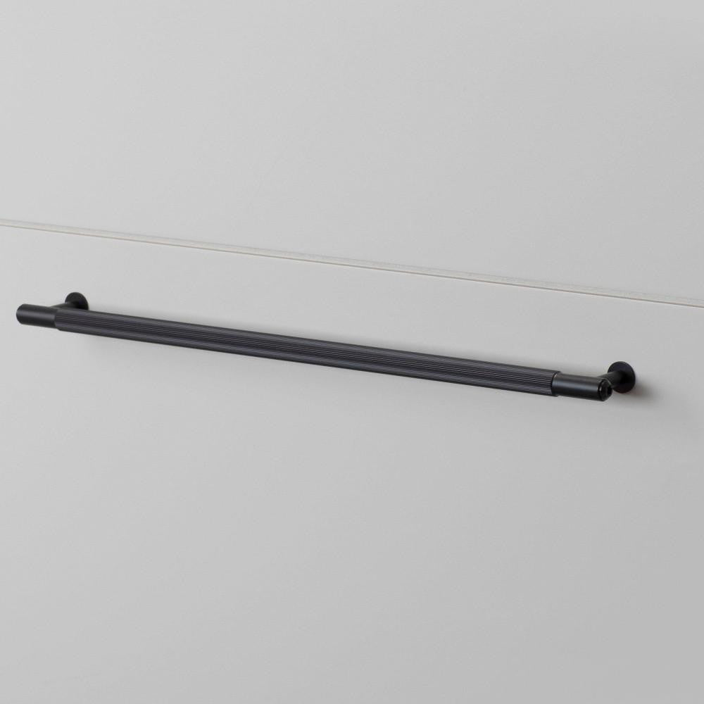 A pull bar made from solid anodised (Black) metal. This pull bar features our signature, diamond-cut, linear-knurl pattern and is refined by hand.They work great on cabinet doors, wardrobe drawers, cupboards, kitchen units and just about anything that can open.