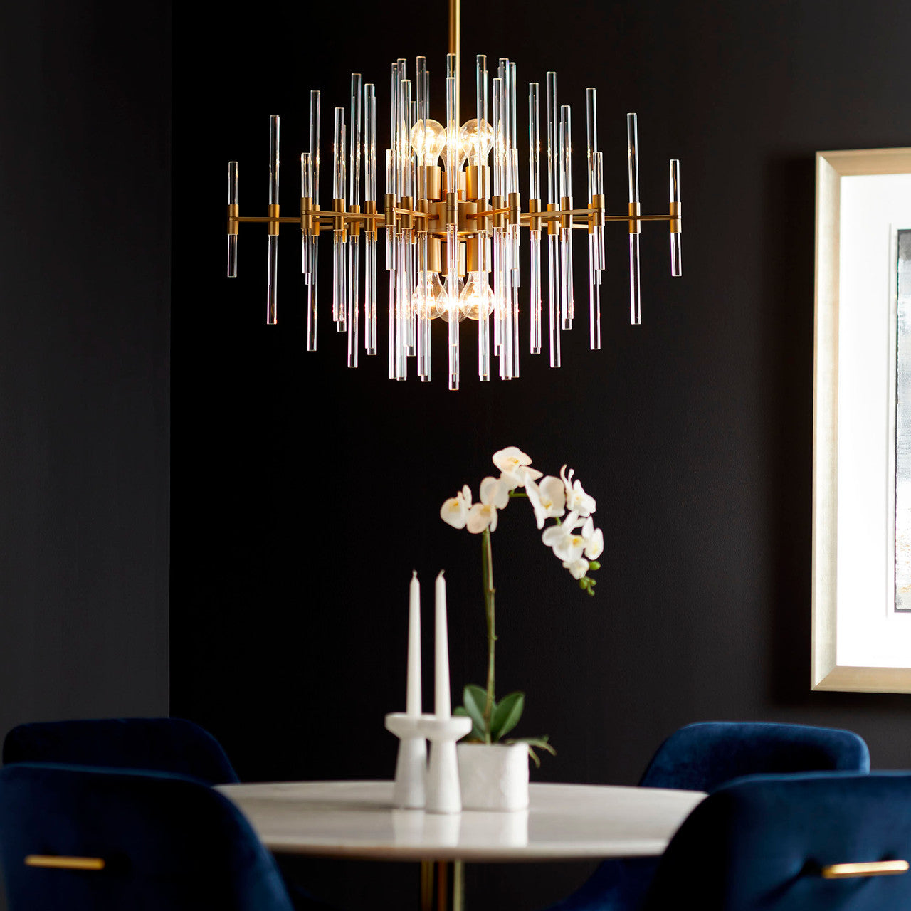 Accent a compact space with the delightful geometric look of this six-light small aged brass and glass pendant. You`ll love the intricate look of linear rods arranged to reflect a staggered presentation, and the beautiful blend of glass with an aged brass base.