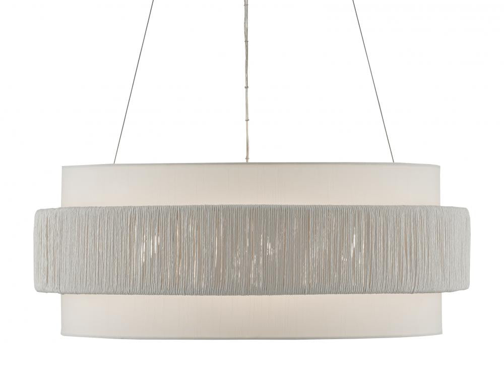 Our Rousham Chandelier has an unusual accent on its fabric shade created by the twine panel made from recycled paper that is twisted and tightly wrapped around a metal frame. The panel made from the sustainable material, which is affixed to the center of the shade, is then coated with a sealant to protect it from moisture. The beige chandelier is suspended with aircraft cable and has a sugar white finish on the interior of the shade, which brightens the light. Adjustable from 20" to 144.5" with use of included chain/rod kit/cable. If your space calls for a longer drop, additional chain/rods/cable is available for purchase.