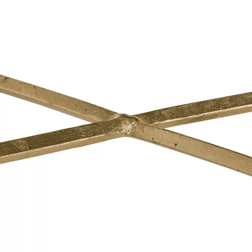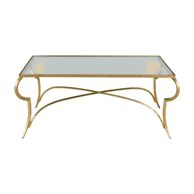 A flowing, organic iron base offers a simple yet graceful design that is revealed through the tempered glass tabletop. Embellished with gold leaf, the table leg styling is reminiscent of the traditional arch motif in India, where this piece was crafted.
