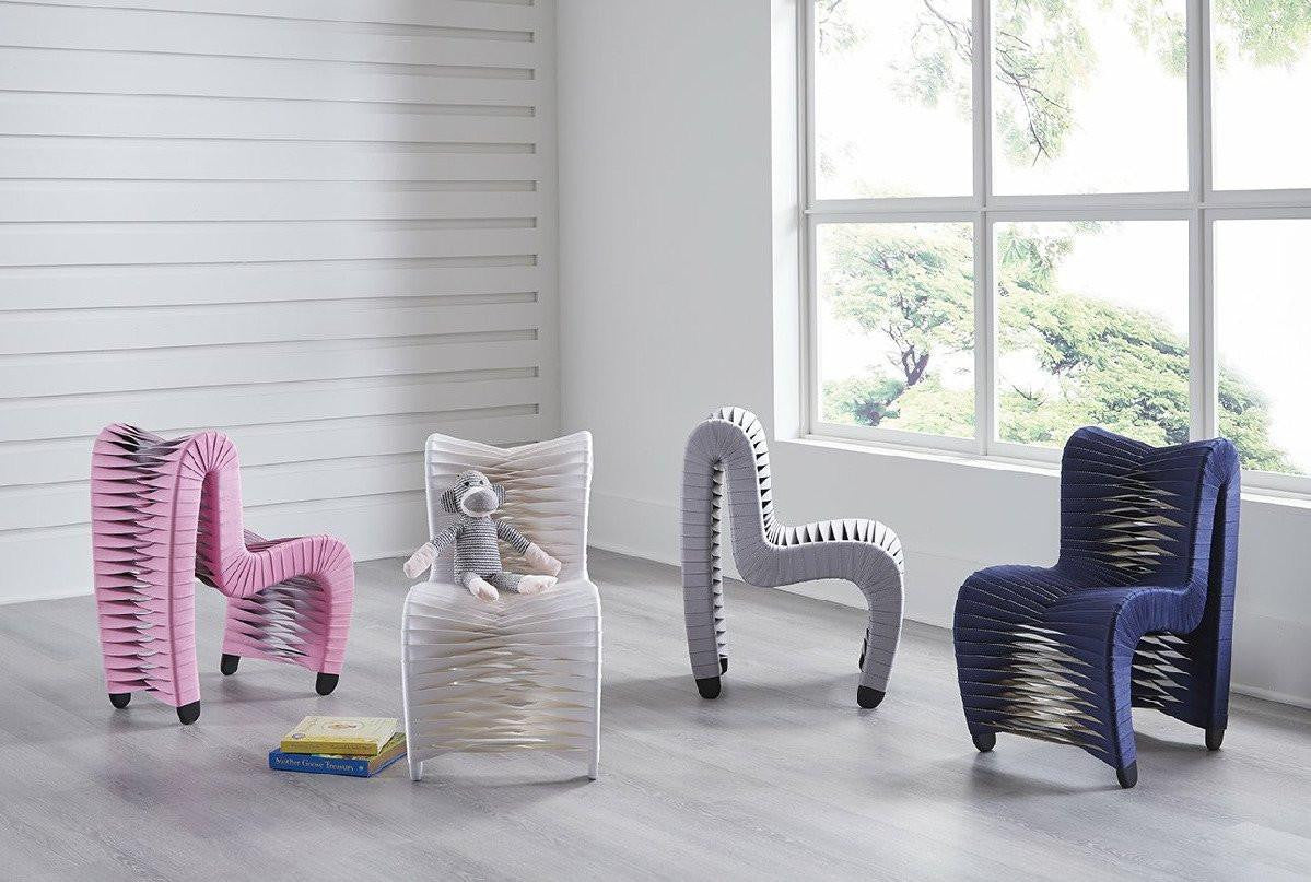 One of our iconic seating collections is also kid sized! We have taken the same design as the full size chair and have made it smaller so kids enjoy it too. The design was inspired by the intertwining spools of fabric seen when visiting a seat belt factory. The collection was created by award-winning Thai designer Nuttapong Charoenkitivarakorn. These striking chairs are easily recognizable by the braided backside and stiletto profile. The straps are woven on a frame made of wood that is reinforced with metal. Pair these chairs in a nursery, playroom, or a bedroom.