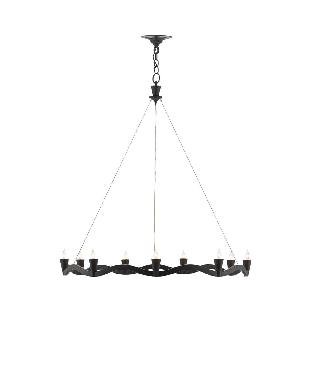 Exhibiting the perfect lightness for the modern castle, our Serpentina Chandelier illuminates a space in waves of good cheer. Made from wrought iron that we have treated to an antique black finish, the lightness of this design is enhanced by the aircraft cable that suspends the serpentine bottom ring from the plumb bob-like top cap. The surprising result of the pared-down shapes is that this fixture can swing from contemporary to industrial chic.