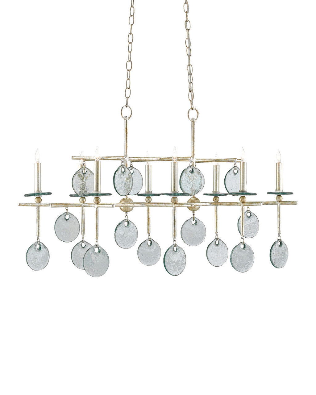 Though geometrically astute in its appearance, this silver version of the Sethos Rectangular Chandelier takes its ornamentation seriously. The linear wrought iron frame has been treated to a silver Granello finish to give the design a bit of sheen. The discs of recycled glass dangling from the arms of the eight-light fixture also glint when light pierces them. The unusual appearance of this chandelier will appeal to those who have grown weary of the ubiquitous candelabra. We also offer this fixture in an old iron finish.