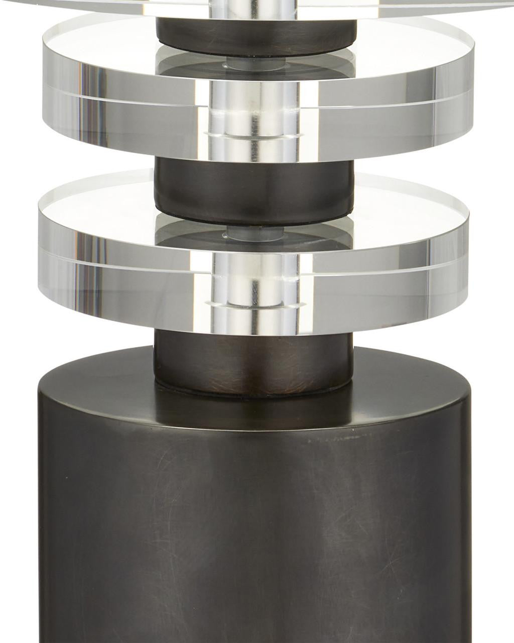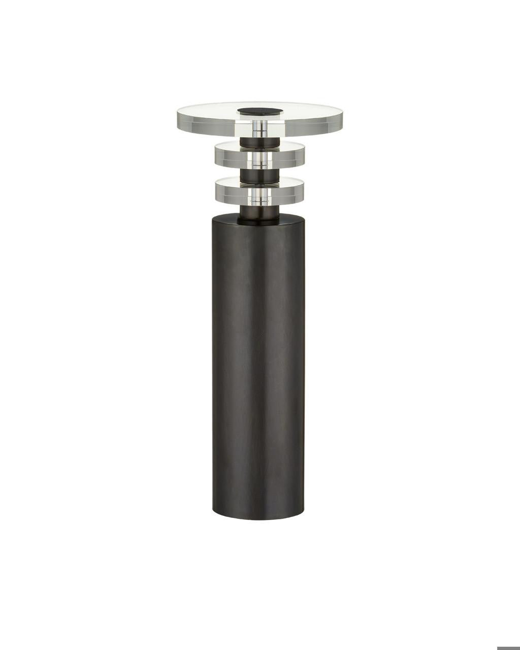 The Shani Bronze Drinks Table is made of bronze-finished metal and discs of clear optic crystal. The profile of this black drinks table makes it an excellent choice for mid-century modern interiors, and it will be particularly perfect for rooms that could use a pop of black. The cap that fastens the top of this columnar drinks table to its pedestal elegantly rises above the surface, adding a unique and distinctive touch to its clean design.