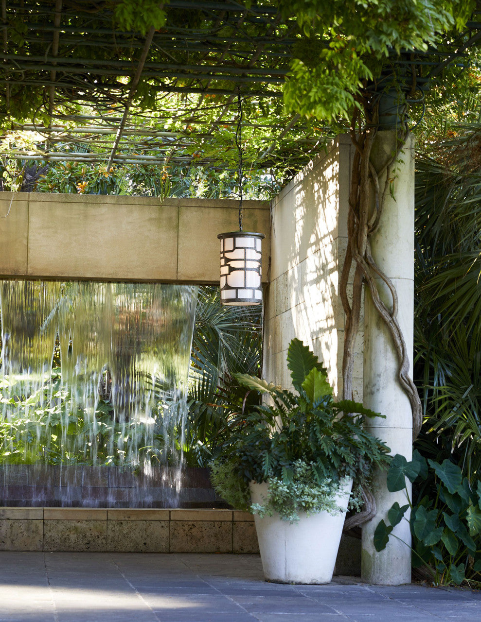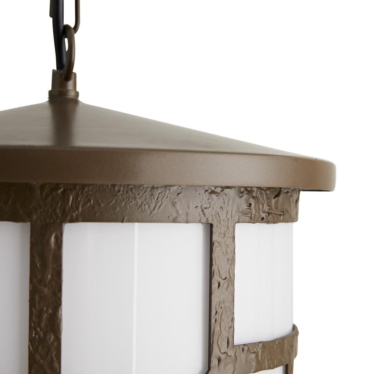 The mid-century craftsman style of this pendant light makes it intriguing and modern, while its grand scale gives it presence. The steel frame is almost sculptural, featuring a linear pattern that is hammered and finished in aged brass, adding to the mid-century modern feel. It conceals a sleeve of opal glass that filters the light from three bulbs, so the light it emits spreads warmly outward and openly downward. Approved for outdoor use.