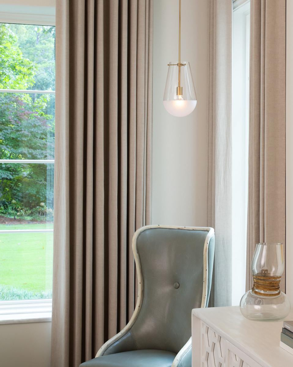 Beck's transitional style is reinforced by a smooth Lacquered Brass or Black finish paired with an etch-dipped glass shade offering texture and visual interest.