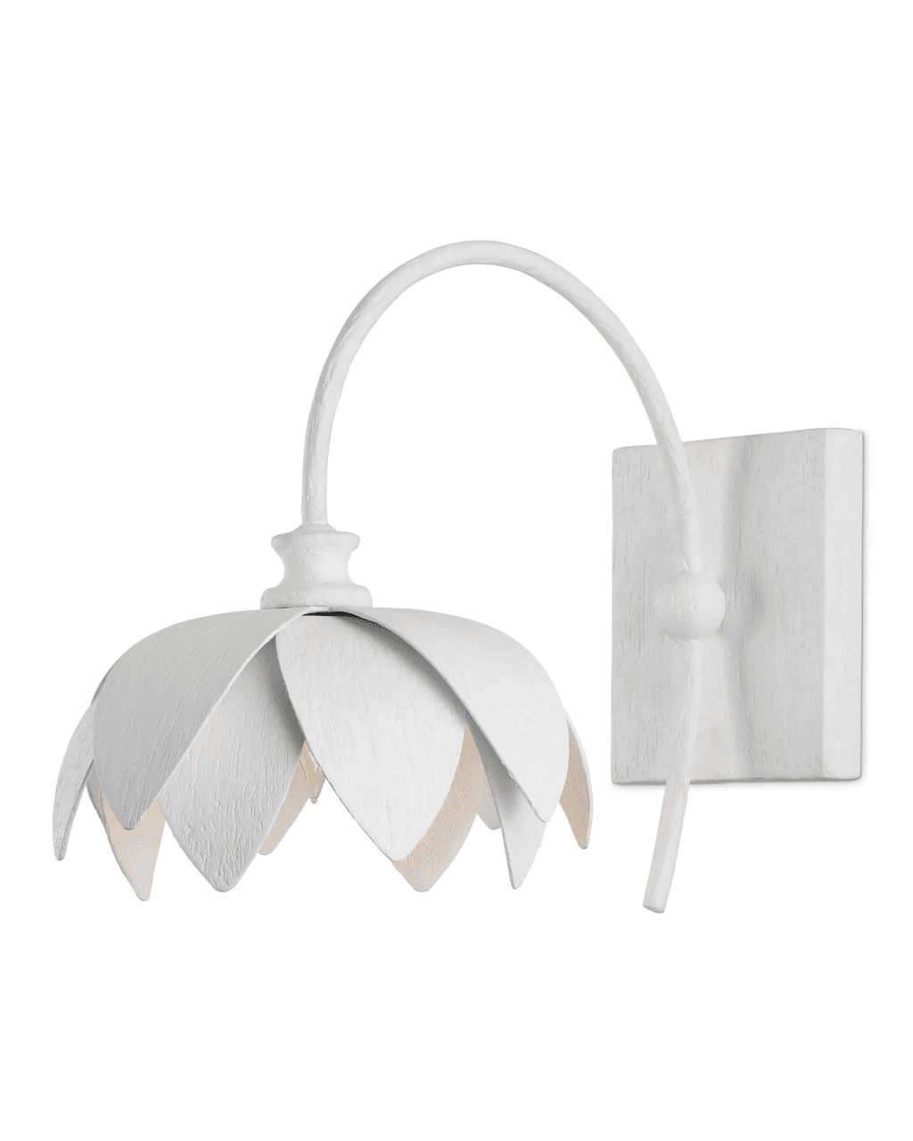 The Sweetheart Wall Sconce is a nature-inspired design. Made of metal in a Gesso White finish, the floral fixture opens its petals to its light source. The white wall sconce can be mounted so that the fixture reflects light up rather than down if desired.