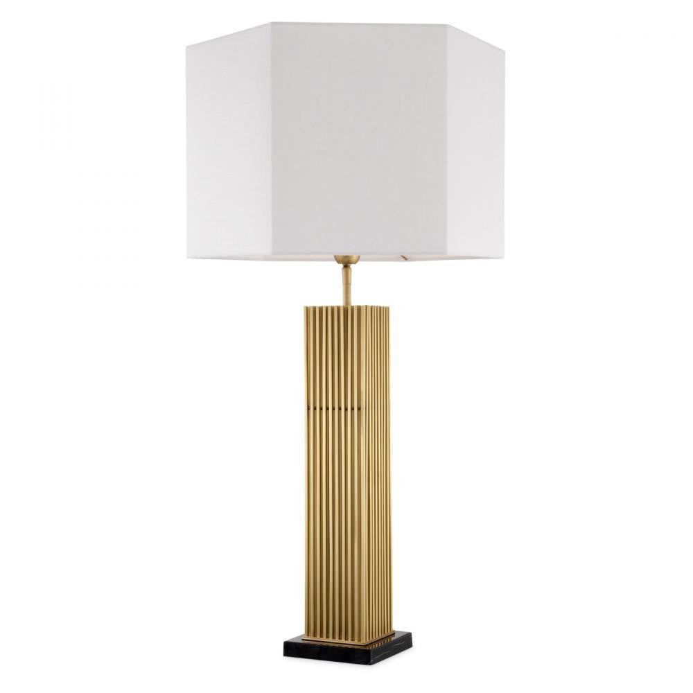 With no less than 96 solid square antique brass finish tubes mounted on a marble base, Table Lamp Viggo is a weighty lamp with a unique look. It is supplied complete with a hexagon white fabric shade which complements the shape of the base perfectly.