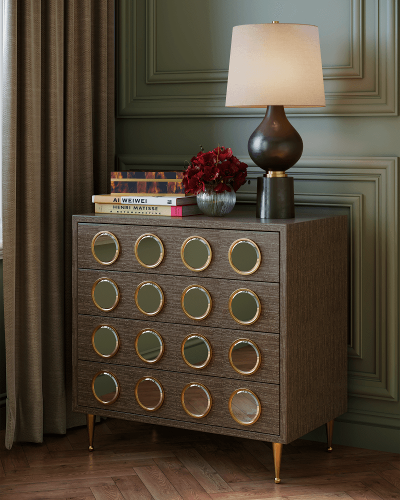 The Tamerlane Table Lamp has an elongated body that looks like a sophisticated trophy shape. Made of aluminum, the geometrical sections are covered in a mix of black nickel and vintage brass finishes. The contrasting brass is perfectly placed in the two rings cinching the body where the tall disc meets the vase shape and the finial.