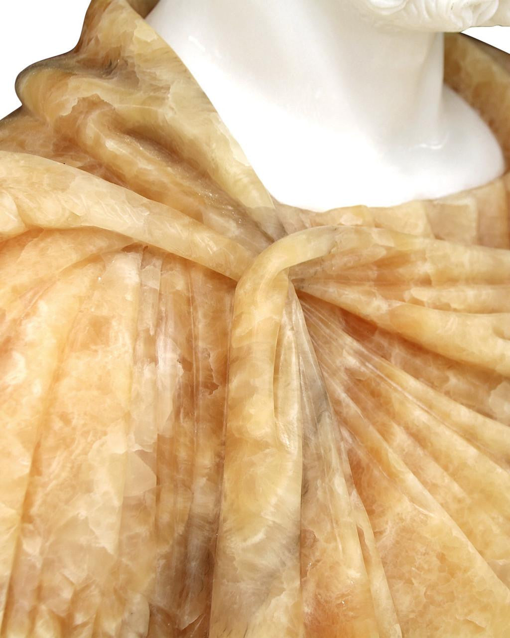 Creating the feel of flowing fabric from marble is a feat, as is evidenced by the Thanos Marble Bust Sculpture. Carved from different types of Italian marble, the Roman bust was inspired by the antiquity period of that great empire. The style of the base on which the bust sits is aesthetically in keeping with an antique sculpture. The color of the marble that makes up the clothing on the gold sculpture will make it a focal point in a room.