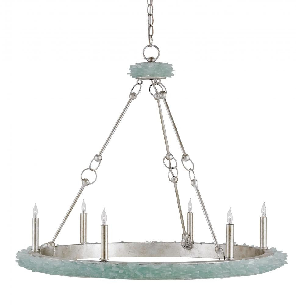 The natural sea-glass that rims the edge of the top and bottom circular elements on the frame of the lovely Tidewater Chandelier is a nod to the balmy waters of the Caribbean. Where this masterpiece of artistry isn’t covered in pale aqua glass, it has been treated to a silver Granello finish. The inter-locking arms that attach the upper ring to the lower one finish off the crown-like frame of this lovely six-light fixture.