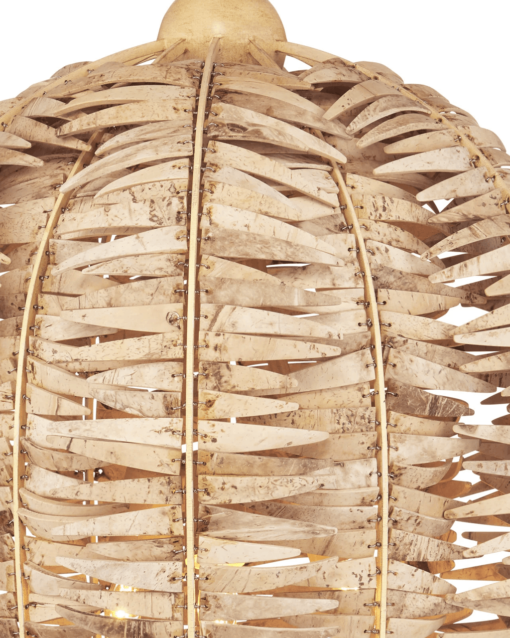 A tremendous amount of effort goes into creating the Tiptur Pendant, as the coconut shells are cut, bleached, drilled, and pinned to the frame by hand to form its bell shape. Tied to thin ribs of wrought iron in a coco cream finish, the color of the shells blends beautifully with the metal to create a veritable work of art. Adjustable from 34" to 102" with use of included chain/rod kit/cable. If your space calls for a longer drop, additional chain/rods/cable is available for purchase.
