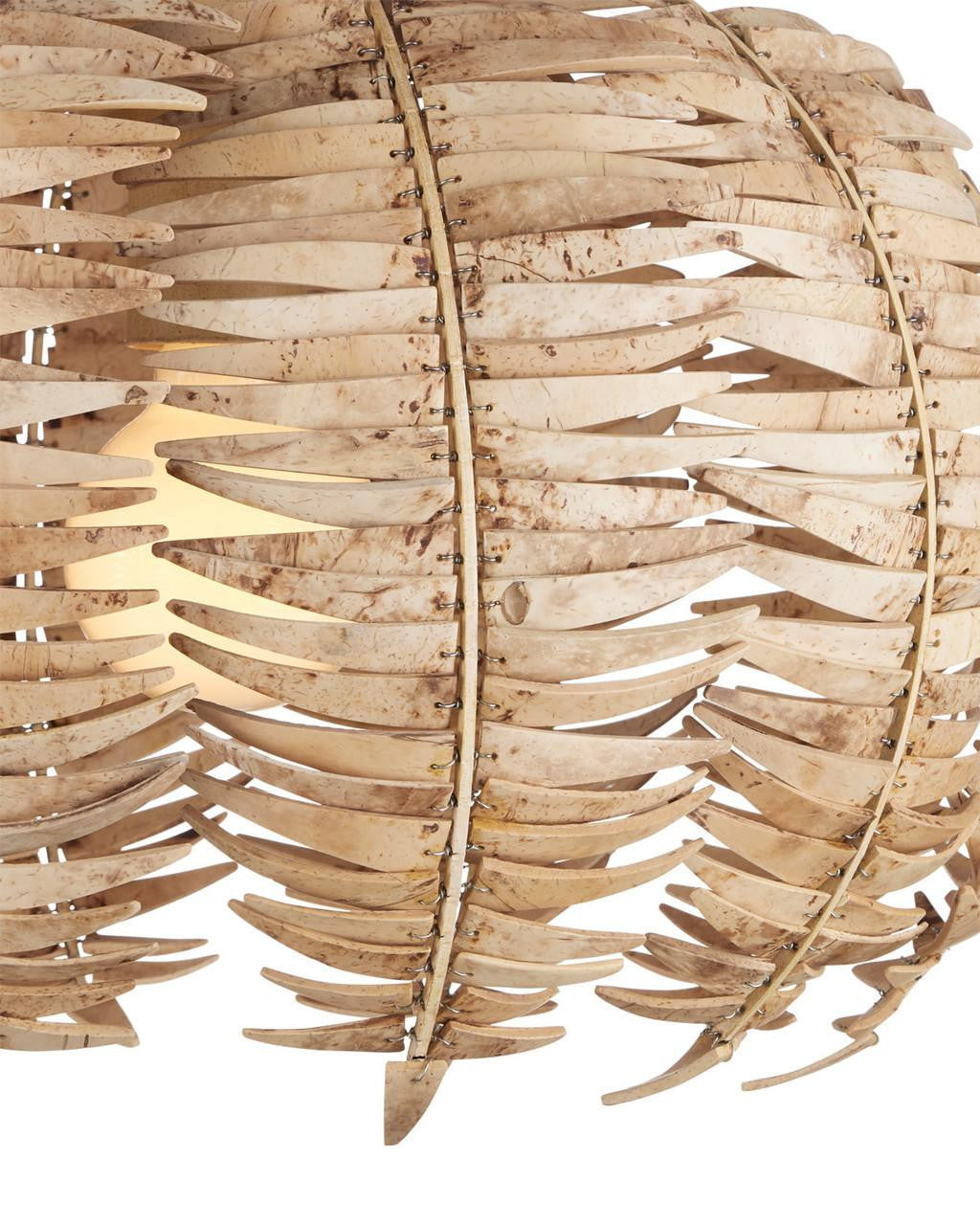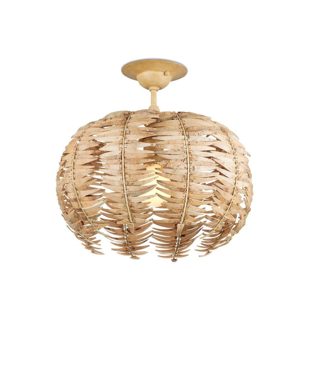 A tremendous amount of effort goes into creating the Tiptur Semi-Flush Mount, as the coconut shells are cut, bleached, drilled, and pinned to the frame by hand to form its orb shape. Tied to thin ribs of wrought iron in a coco cream finish, the color of the shells blends beautifully with the metal to create a veritable work of art.