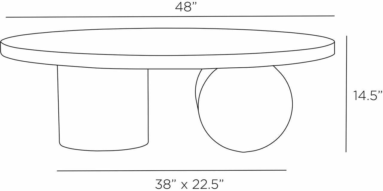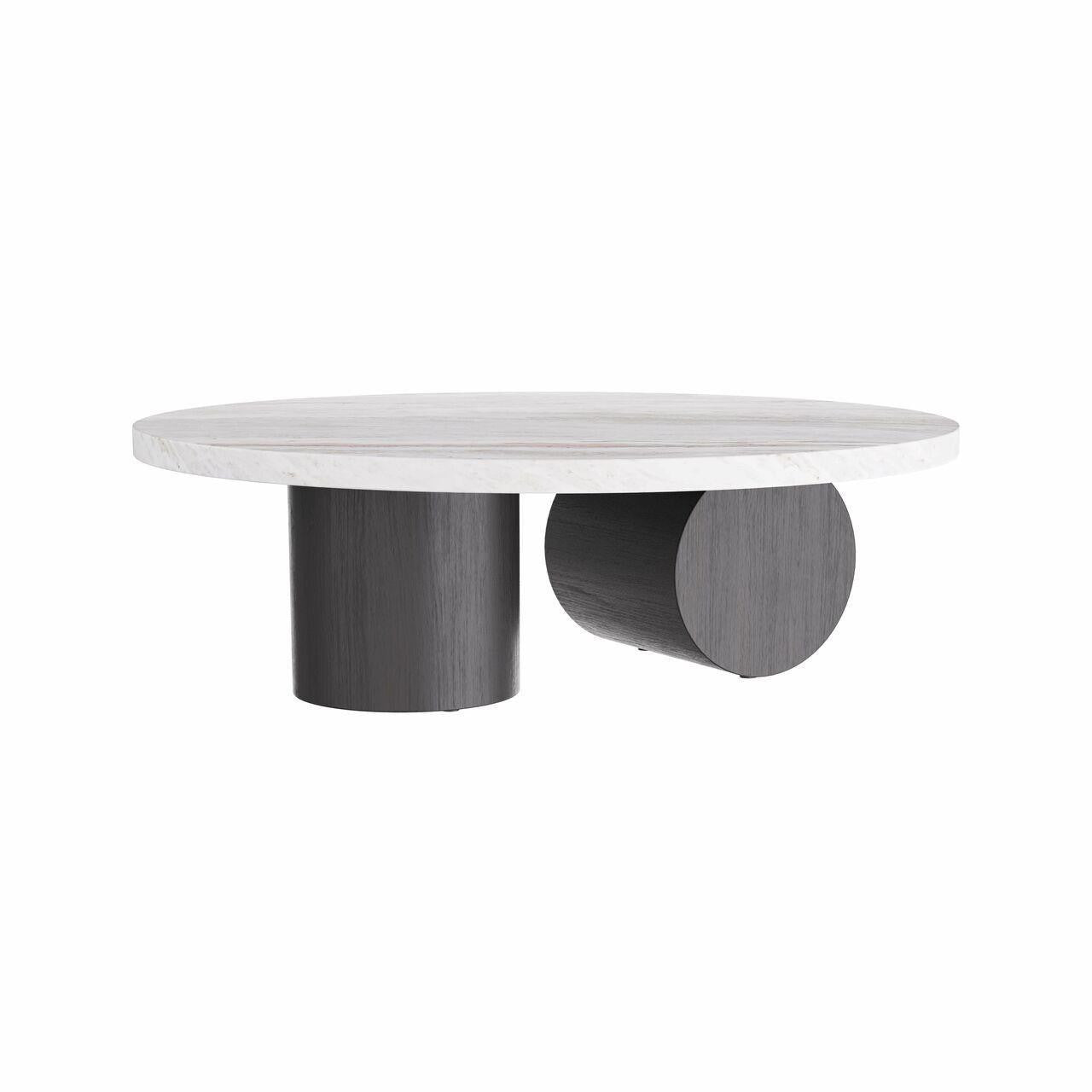 Our sculptural torrington coffee table is executed with a minimalist sensibility with a focus on geometry and the exploration of forms. The monumental table is crafted in a toronto leathered marble oval top, with robust columnar, ebony oak shapes forming the base pedestals. Finish will vary.