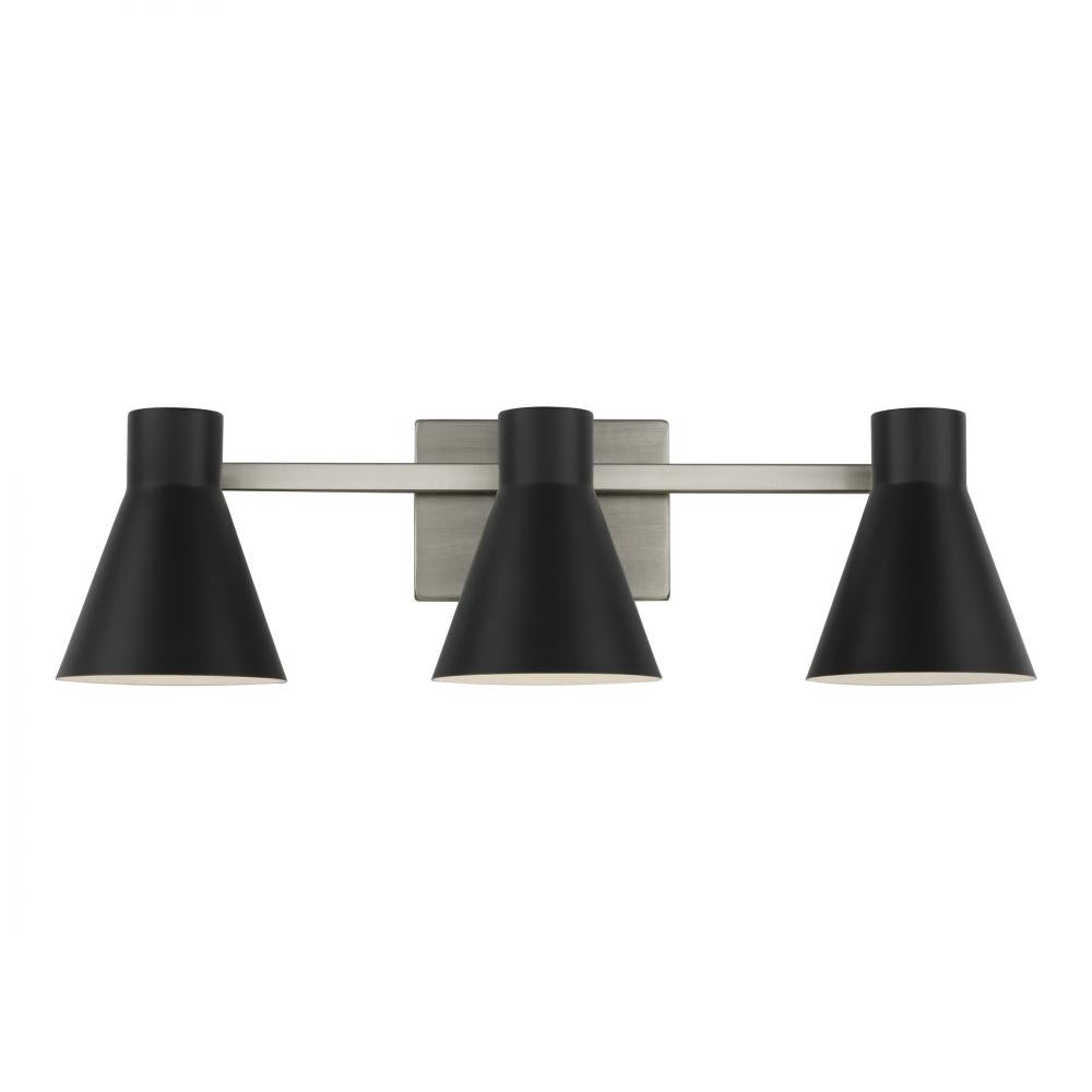 The Sea Gull Collection Towner three light vanity fixture in black is an energy star qualified lighting fixture that uses led bulbs to save you both time and money.The Towner lighting collection by sea gull collection brings mid-century, retro style to the traditional circular silhouette, creating a bold statement that would accent any space in your home.The conical light shades deliver a fun design statement along with the textured cloth cords, which are adjustable for leveling.These fixtures are ideal for dining room lighting, living room lighting and kitchen lighting.The assortment includes three-, five- and seven-light chandeliers, three- and five-light cluster pendants, eight-light island pendants, one-light mini pendants, and one-light wall sconces.The Towner collection is available in two finishes, satin bronze and brushed nickel to complete the look.All fixtures are available as energy star-qualified and California title 24 compliant.