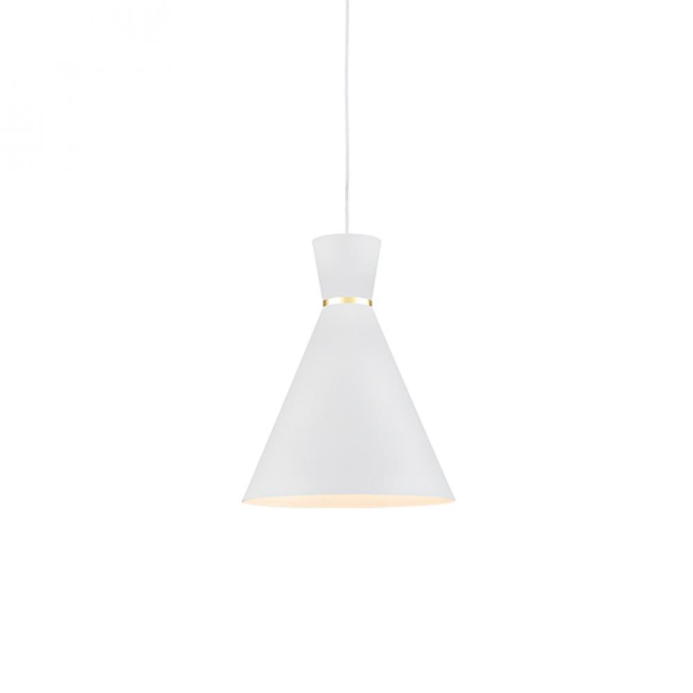 Single-lamp pendant with conical aluminum shade with fine powder-coated finishes and anodized gold ring detail. Exterior shade colors are white or black, with matte white interior. Suspended by cloth cable.
