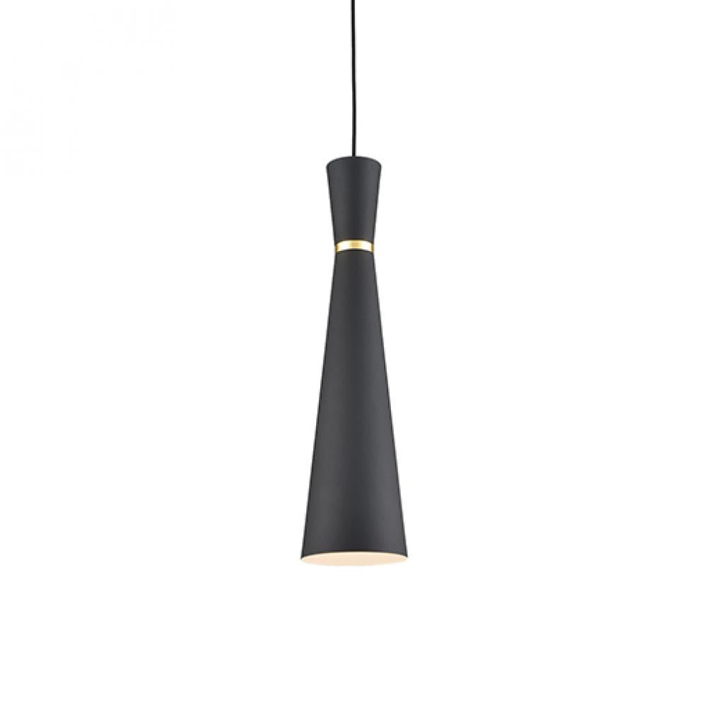 Single-lamp pendant with conical aluminum shade with fine powder-coated finishes and anodized gold ring detail. Exterior shade colors are white or black, with matte white interior. Suspended by cloth cable.