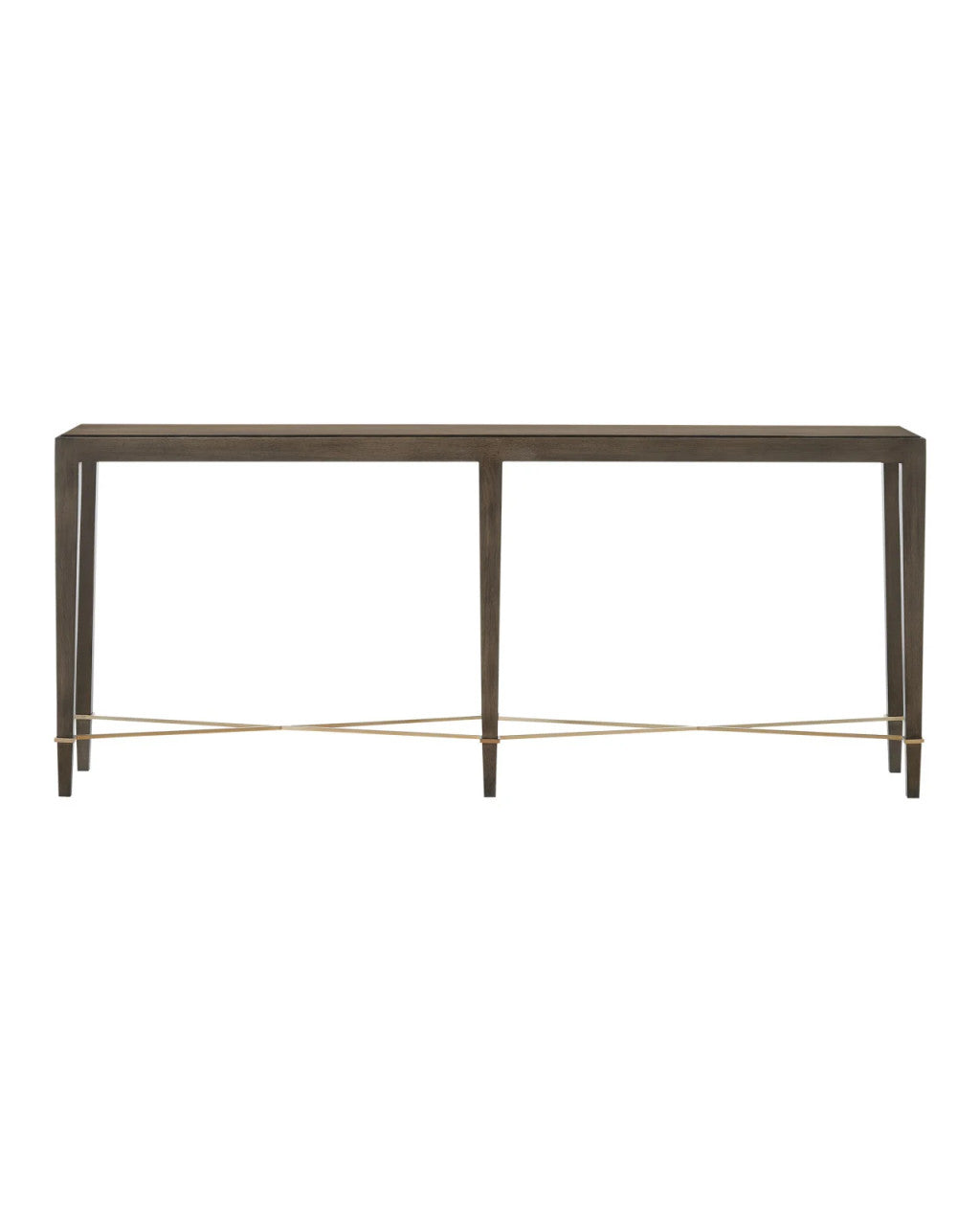 X marks the spot when the Verona Chanterelle Console Table is introduced into a room. Made of mahogany that has been treated to a woodland-inspired chanterelle finish, it has been given a sexy touch of gold with the champagne-finished metal detailing. This is one of our pieces that proves the brilliance of our design team, as the stretchers that clasp each leg are so chicly rendered, they artfully meet at a crosshatch in the middle of the negative space. There are a number of pieces in several finishes in the Verona family of furnishings.