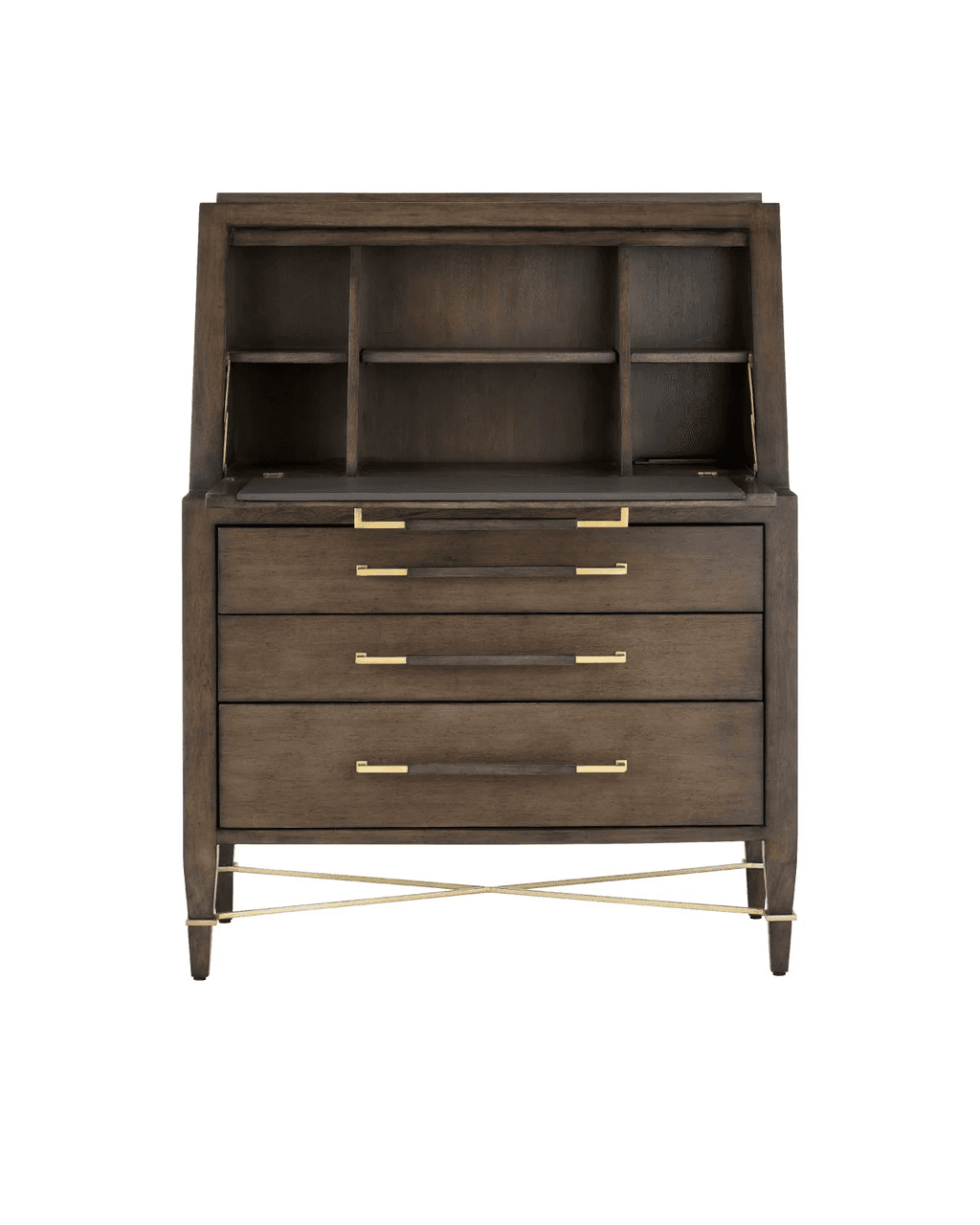 The Verona Chanterelle Secretary Desk is darkly handsome covered in a chanterelle finish with metal detailing in a champagne finish. The stretchers on this brown desk create added interest to enhance its flair. The beautifully detailed drawer pulls with centers that match the finish on the wood are gold on each end to enliven each drawer with their metallic sheen. The top folds down on this classic piece to reveal a desktop, a center-adjustable shelf, two fixed shelves, built-in power outlets, and two USB ports.